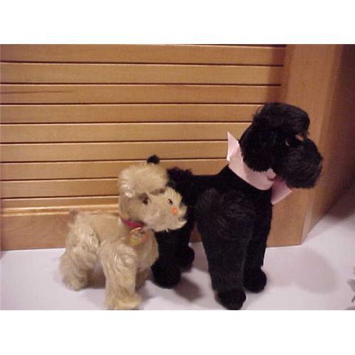 The larger poodle is black and about 9" tall. the smaller poodle is beige and 6" tall. Both have their ear buttons. The smaller one also has his red collar and the paper tag which says Snobby. I think both are mohair and in good condition. Very little loss of mohair is noted. The pink bow is a replacement. The black dog has a swival neck .
