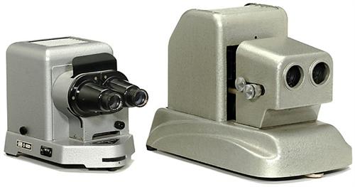 2 Stereo Projectors and Accessories 1) "Belpalscus V", VEB Kamerawerke Dresden, film size 41 x 101 mm, stereo lens "Auxanar 3,5/80 mm". - 2) Stereo projector "Pinsch-Bamas", Berlin, for 6 x 13, stereo lens Will-Optik, Wetzlar, "Maginon 2,5/80 mm", only small number ever produced. - And: 12 Zeiss-Jena stereo glasses and approx. 100 Belplasca stereo slide frames.<Br>