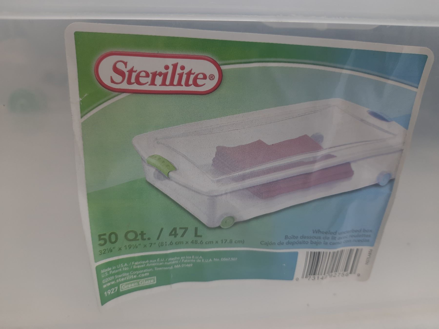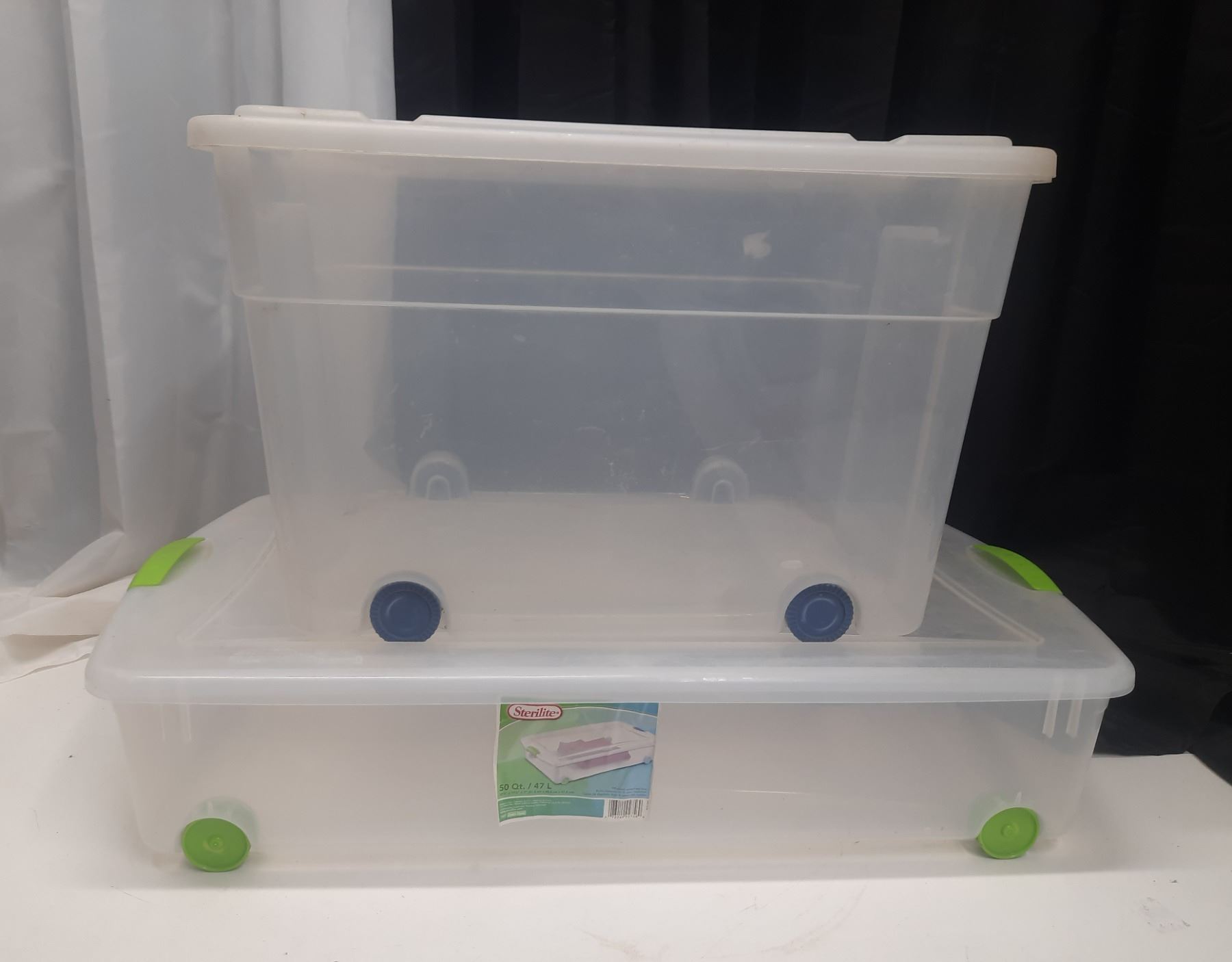 (2) Sterilite Clear Storage Container with Wheels. (One is 47L and one is approx 60L)