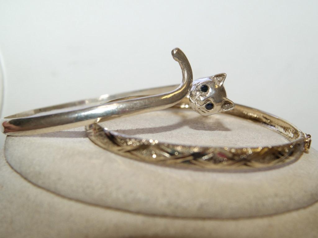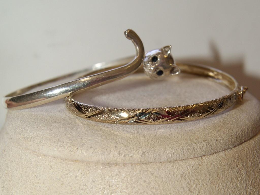 (2) Sterling Bangle Bracelets- (1) Cat W. Sapphire Eyes and (1) Diamond Etched Sold Times the Money