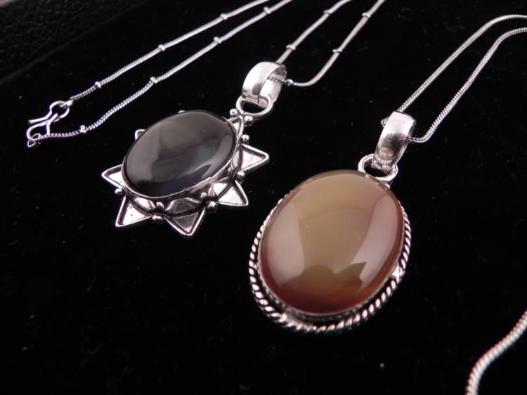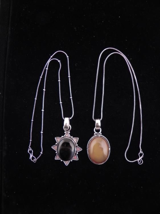 2 different Pendant NecklacesGemstones: Amber, Smokey Quartz Cut: Oval, smooth Pendants: 24 and 28 mm stones, on sterling rope pattern and star shaped settings, on 15 and 17" chainsCondition: Excellent