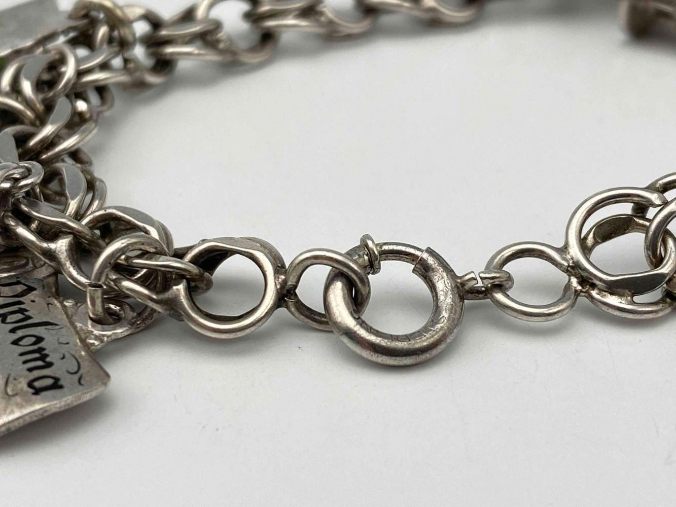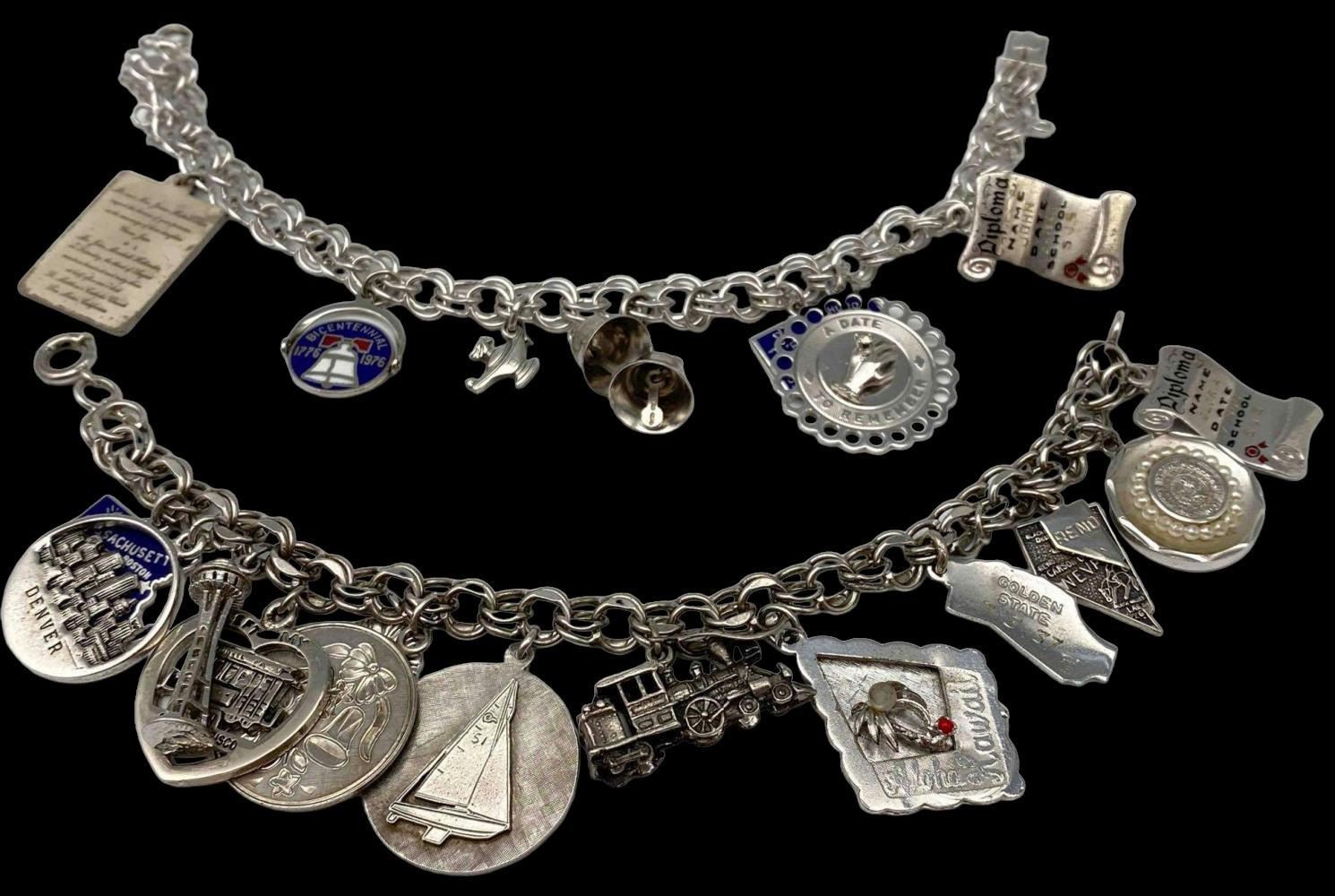 2 Sterling Silver Charm Bracelets With 20 Charms, 92.8g. Marked Sterling, 925. Both Bracelets Approximately 7.0L in, Largest Charm Approximately 1.25L x 1.0W in. ALL CREDIT CARDS WILL BE MANUALLY VERIFIED PRIOR TO SHIPMENT.