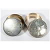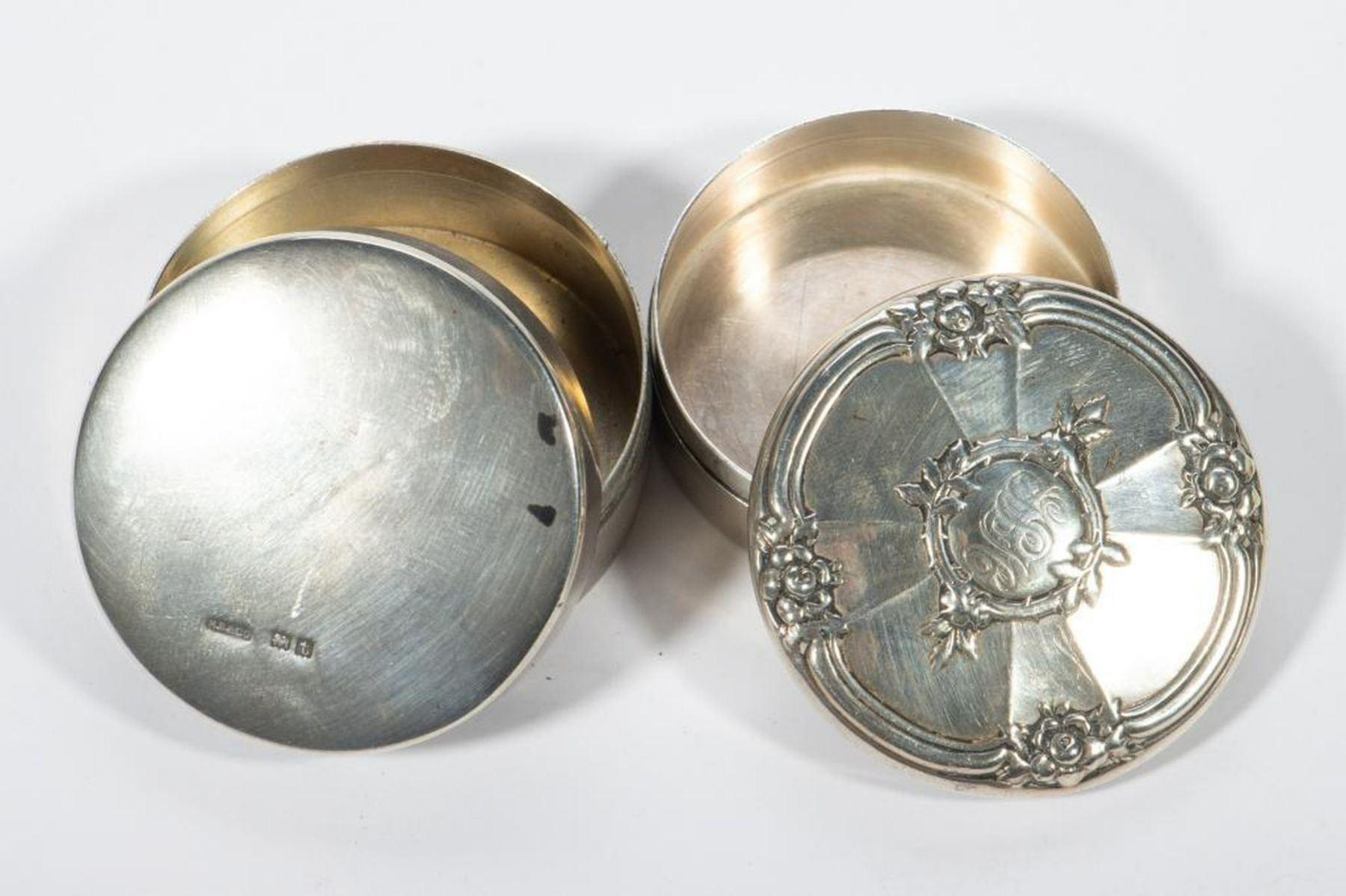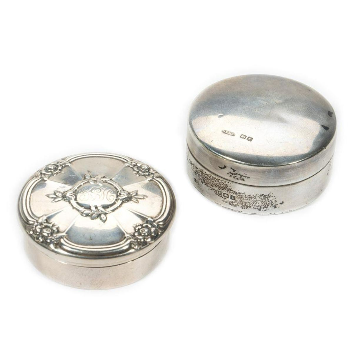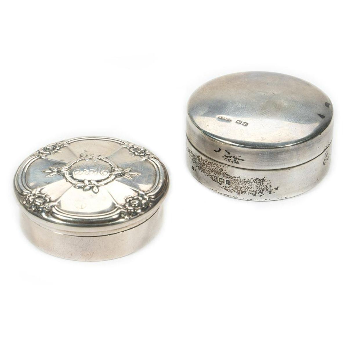 The undecorated box marked "HB&Co [lion] t" and "HB&Co. [anchor] [lion] t." The other with rose design and central monogram; marked "Sterling Patent/ 2." Each approx. 1 3/4in. diameter. 60 grams total.