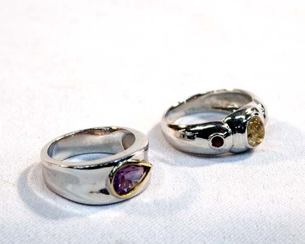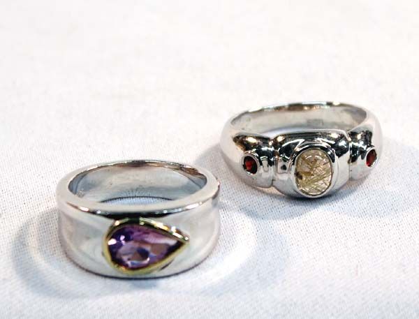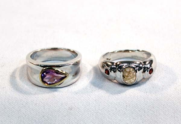 2 Sterling Silver Rings. Size 10 sterling silver rutilated quartz ring with 2 small garnets. From Thailand. Sterling silver ring size 9 with faceted amethyst stone framed with gold plate edging.