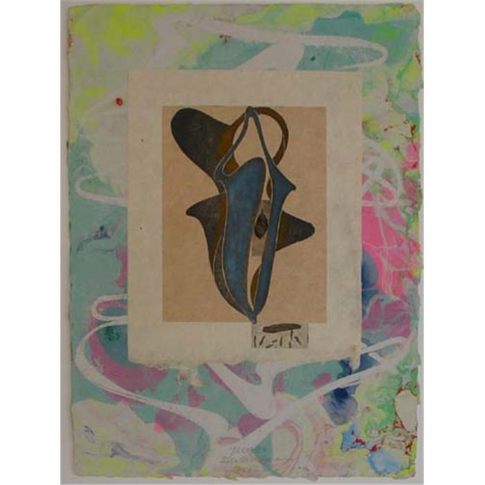 Description: two color monoprints and collage mounted on multi-color hand made paper