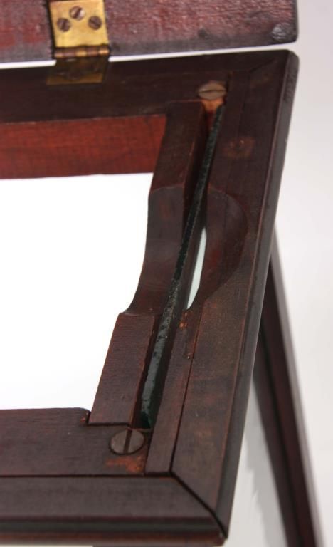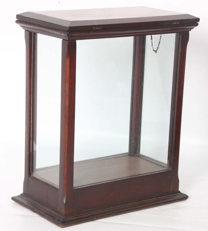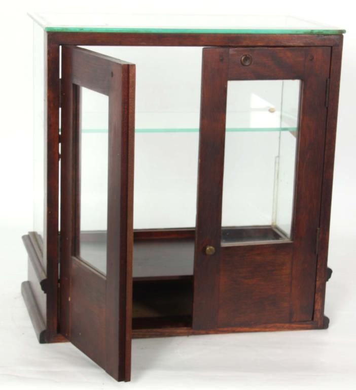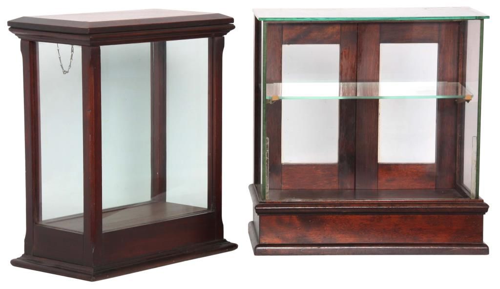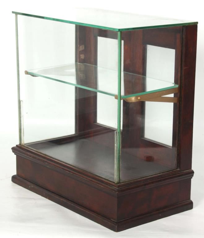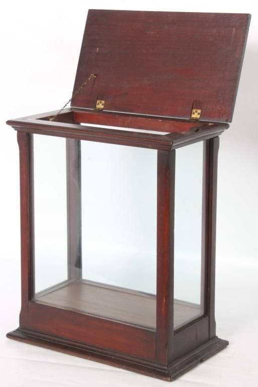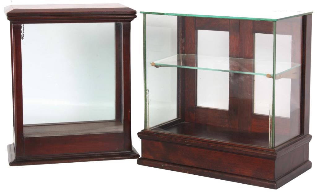 2 Store Countertop Display Cases. Walnut display case has glass front, sides, top and a single shelf with 2 doors in the back with glass panels, has an original finish and is in good condition; 17.25 in. high x 17 in. wide x 9.25 in. deep. The cherry display case has glass on 4 sides and a hinged lift-top lid, in very good condition, refinished. 17.5 in. high x 14.75 in. wide x 8.5 in. deep.