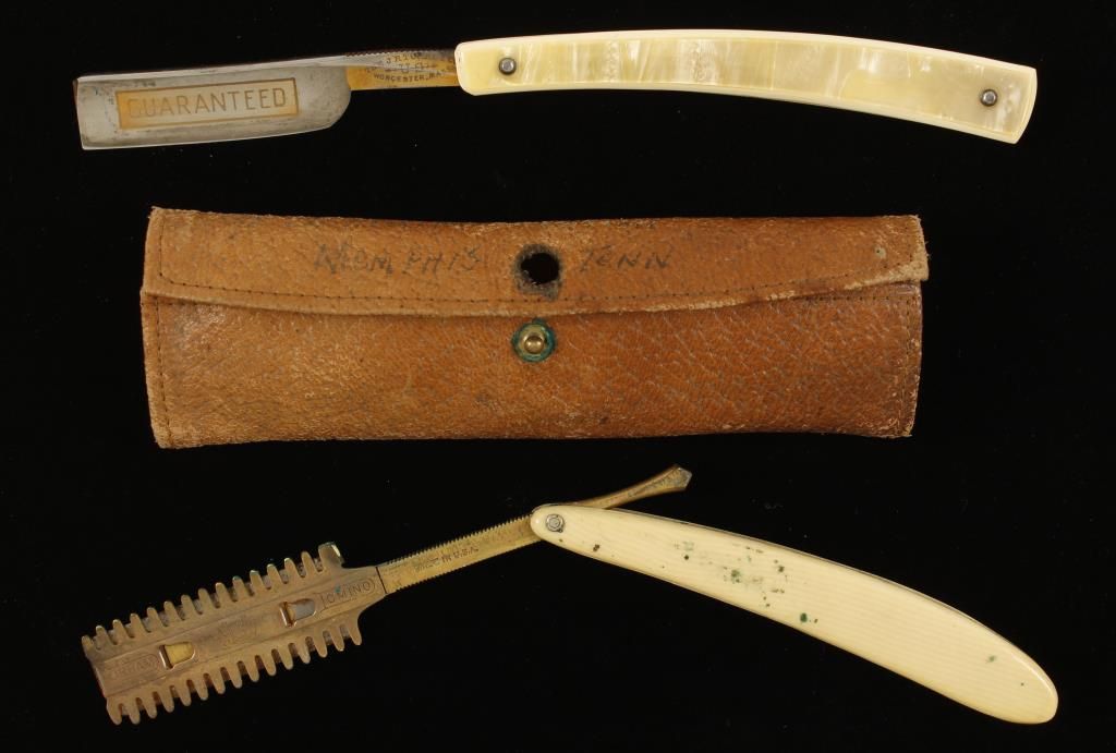 And leather case. (1) By "The J.R. Torrey Co. Worcester, Mass". Blade marked "Guaranteed". (1) Marked "Durham Domino", and "Pat U.S.A. May 28.07". Includes extra blade guard and original replacement razor blades, which have patent date 1910. The leather case is aged, and the button has separated from the leather.