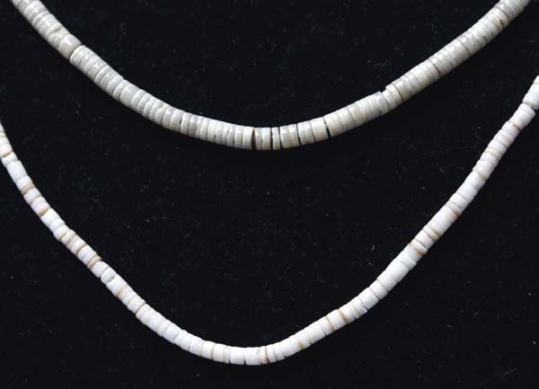 2 Strands of Native American Navajo Carved Shell Heishi Beads, natural tone, includes 3 sizes of beads, one measures 25.5''L while the other measures 36''L