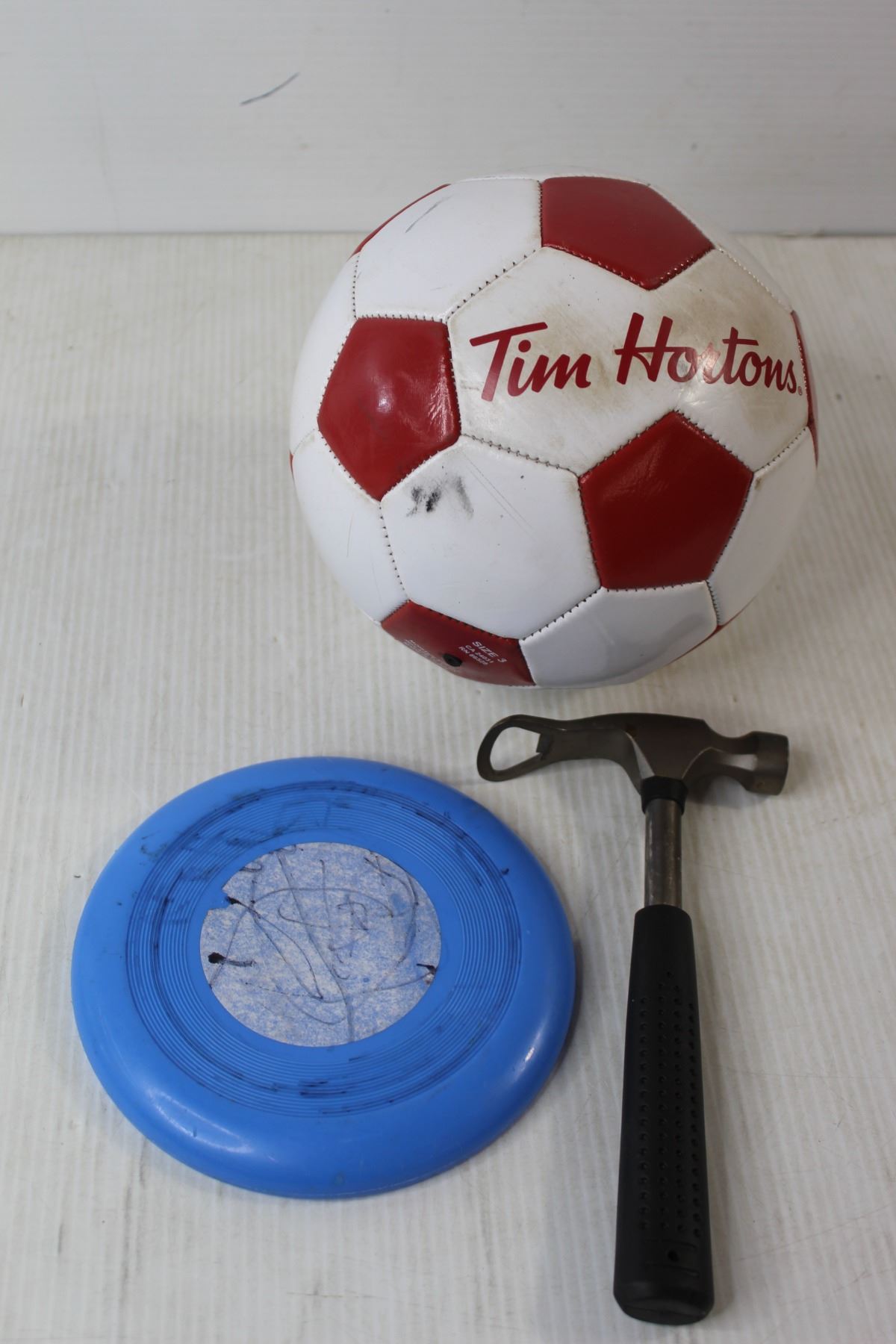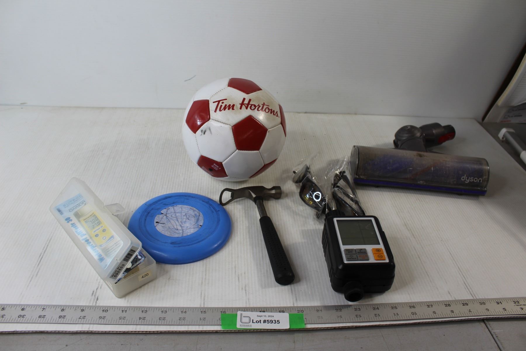 (2) Sunglasses, Dyson Vacuum Extension, Crosofmi Watering Timer, Tim Hortons Soccer Ball, Hammer Bottle Opener, Frisbee, Oaklon Waterproof PhTester