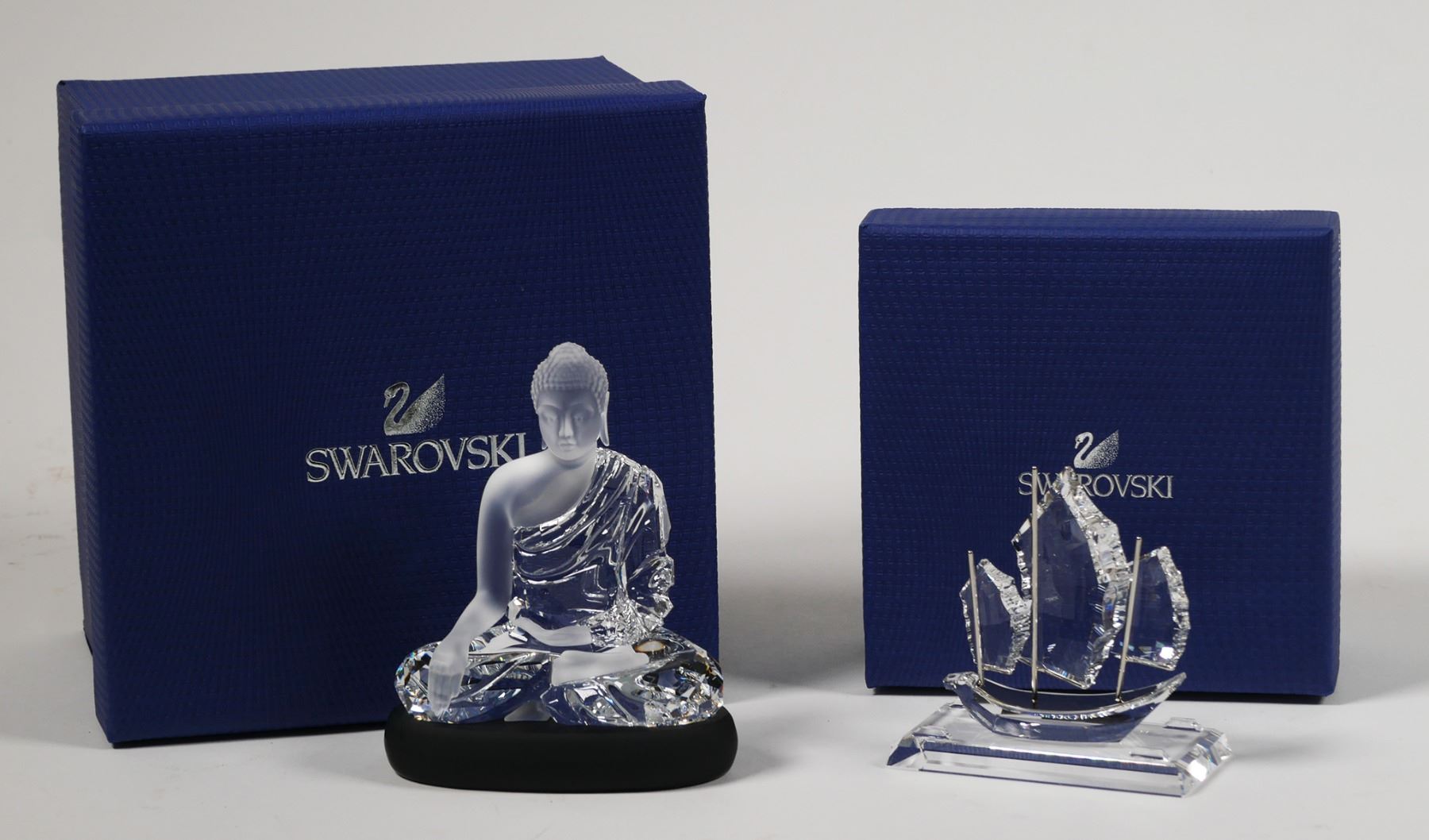 Two crystal figurines by Swarovski, including Buddha (5064252) and Sailing Junk (5030115). Circa late 20th, early 21st century. All Mint in Box. MIB. Various sizes.