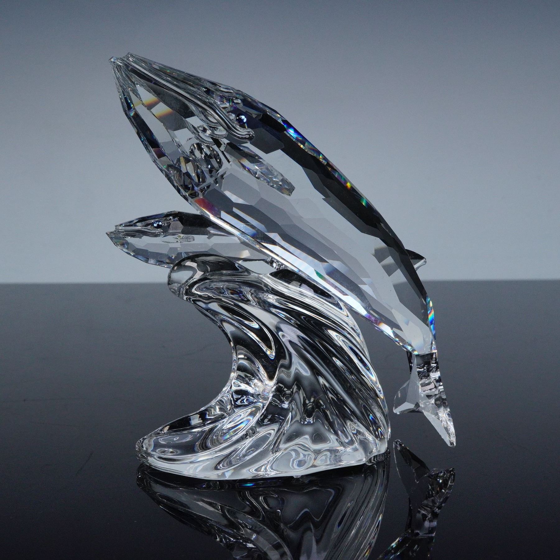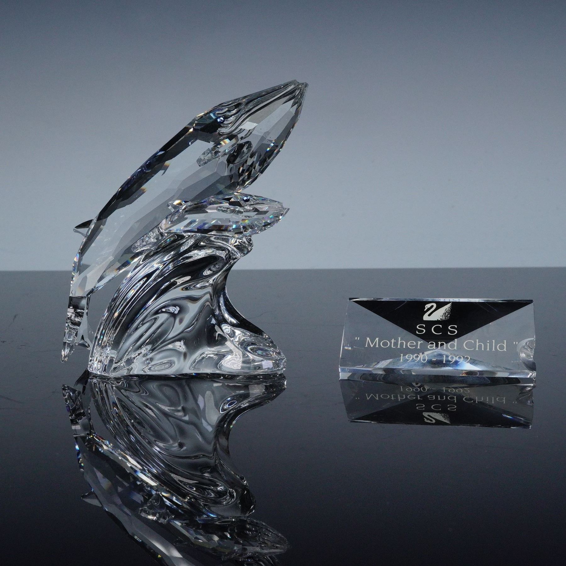 This elegant piece, titled "Care For Me," depicts a pair of dolphins, the mother and calf gracefully emerging from stylized waves, rendered entirely in precision-cut clear crystal that captures and refracts light beautifully. The base features the SCS swan logo etching, denoting authenticity. The rectangular plaque bears the inscription "SCS Mother and Child 1990-1992," also etched with the swan emblem. Model number 164614. This item has its original box.