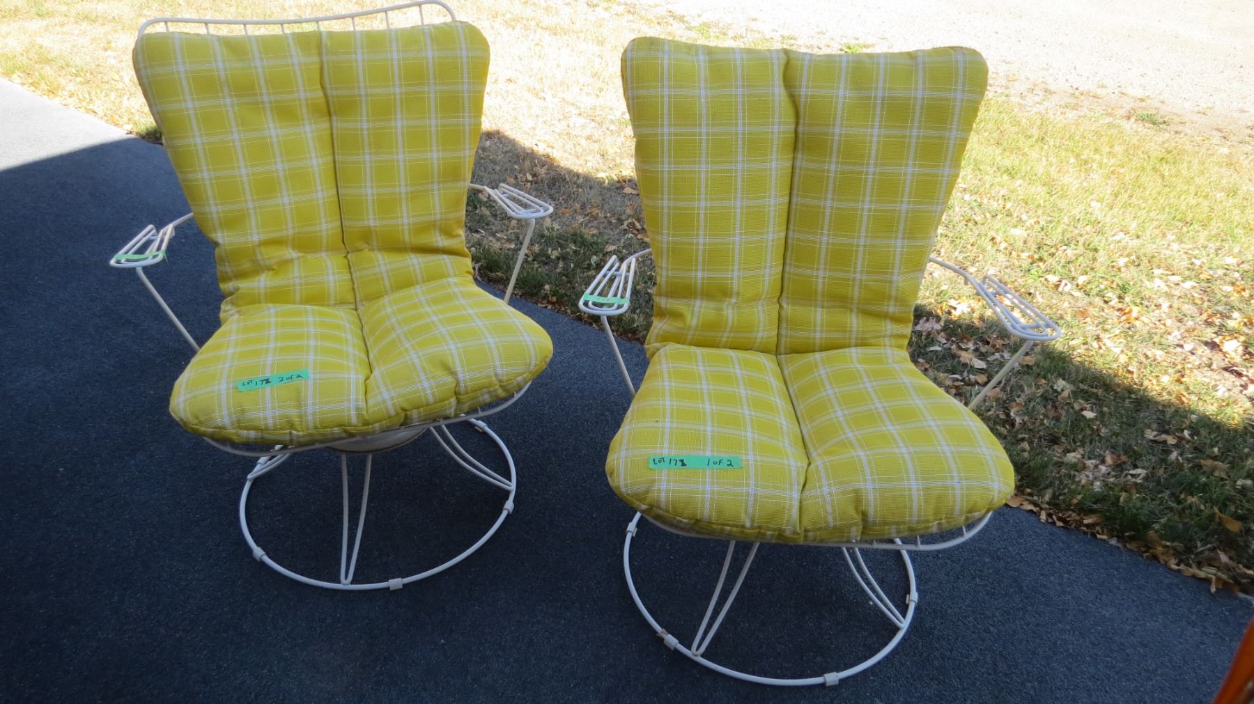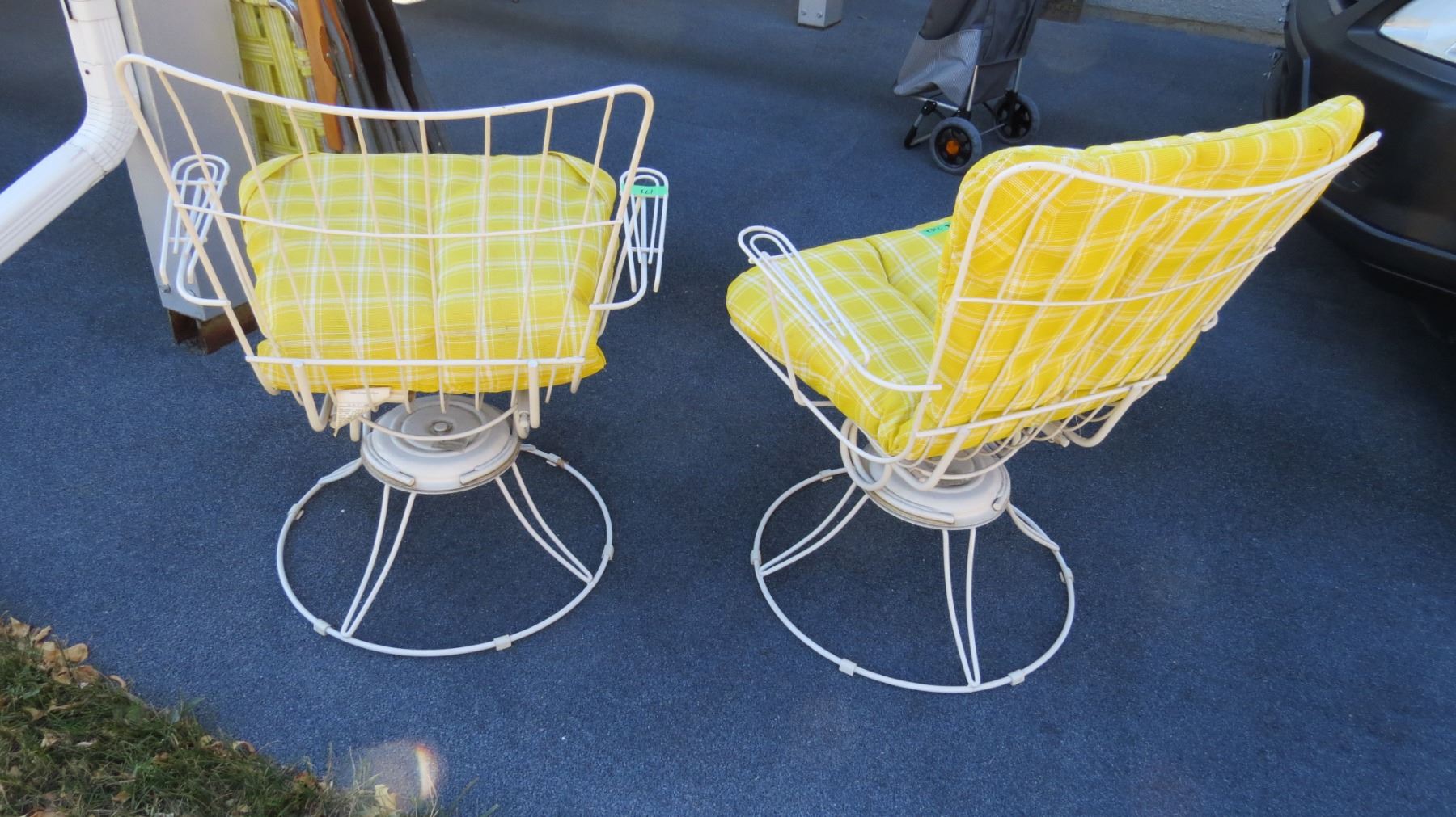 (2) Swivel patio chairs with cushions (cushions have a slight musty odour)
