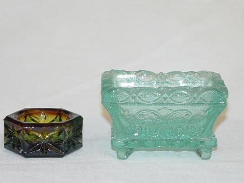 (2) TABLE SALT DISHES: (1) DEEP AQUA LACY MASTER SALT & (1) INDIVIDUAL PATTERN GLASS SALT OF UNUSUAL AMBER TO GREEN TO AQUA COLOR - WEAR & IMPERFECTIONS
