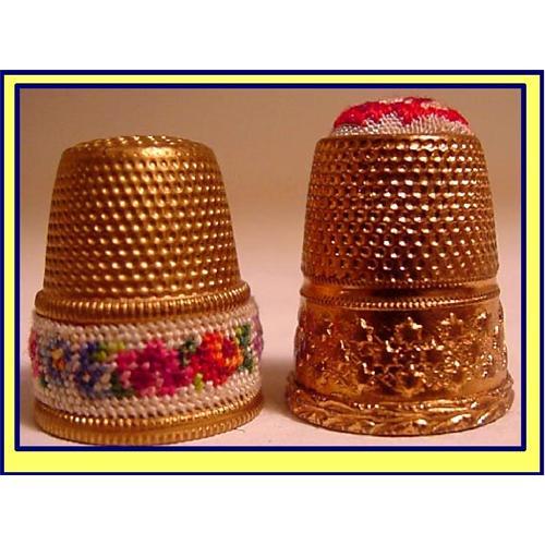 Lot of 2 thimbles, each handembroidered with beautiful petite point tapestry work.