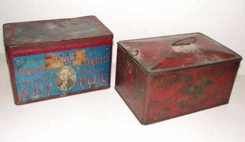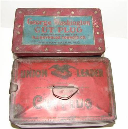 2 TOBACCO ADVERTISING TINS. Red tin with gold decoration of eagle marked “Union Leader Cut Plug” AND Blue tin with portrait of George Washington marked “George Washington Greatest American Cut Plug”. Union Leader tin in good condition with minor to paint, George Washington tin with moderate loss to paint and some scratches to front.