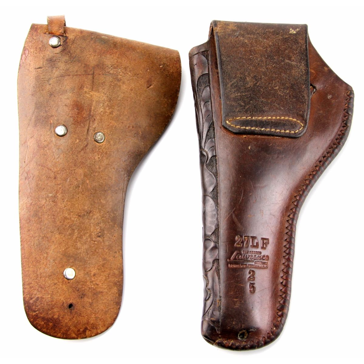 2 TOOLED LEATHER HOLSTERS SAA 5.5 INCH REVOLVERS Two tooled leather holsters for Colt SAA style 5.5 inch revolvers. One maker marked Lawrence,the second unmarked. Both in very good condition. Condition: