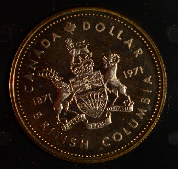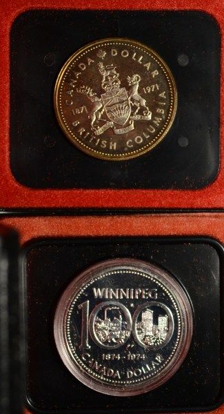 1971 HAS .6 Oz. SILVER AND BEAUTIFUL TONING, BOTH DOLLARS ARE IN ORIGINAL ROYAL CANADIAN MINT BOXES, EST. $50.00 TO $55.00