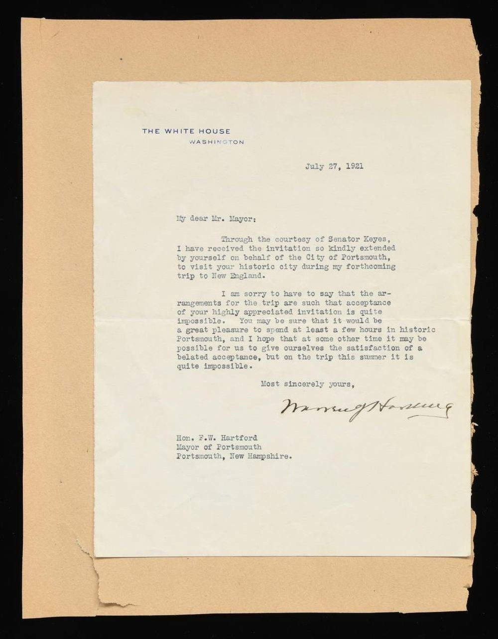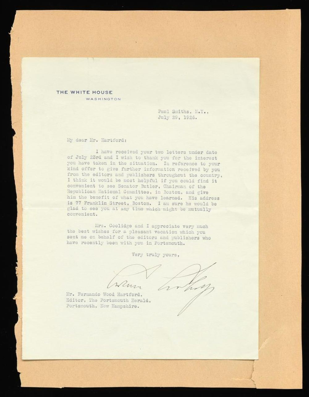 HARDING. 1) COOLIDGE. The letter itself measures approximately 9” x 7”. The heading at the top, printed in black, reads “THE WHITE HOUSE WASHINGTON”. The letter is dated July 29, 1926 and appears to thank a gentleman named F.W. Hartford of Portsmouth, New Hampshire for his work supporting Republican causes. The letter is boldly signed “Calvin Coolidge”. CONDITION: the letter is partially glued to a backing paper at the very top of the sheet and shows very light wear with nearly no discoloration. The typed sections are very clear and the signature remains strong. 2) HARDING. The letter itself measures approximately 9” x 7”. The heading at the top, printed in black, reads “THE WHITE HOUSE WASHINGTON”. The letter is dated July 27, 1921 and appears to thank a gentleman named F.W. Hartford of Portsmouth, New Hampshire for his invitation to visit Portsmouth during a forthcoming trip to New England. The letter is boldly signed “Warren G Harding”. CONDITION: the letter is partially glued to a backing paper at the very top of the sheet and shows very light wear with nearly no discoloration. The typed sections are very clear and the signature remains strong. (02-21850-3/BF). $1,400-2,000.