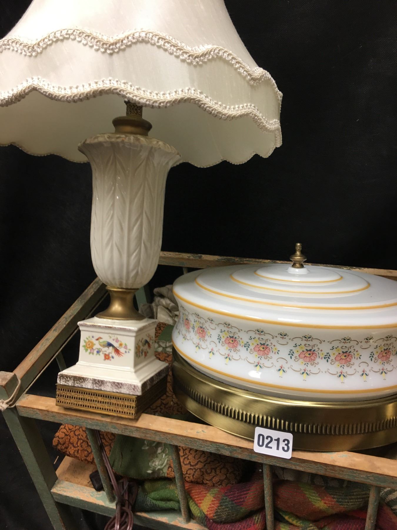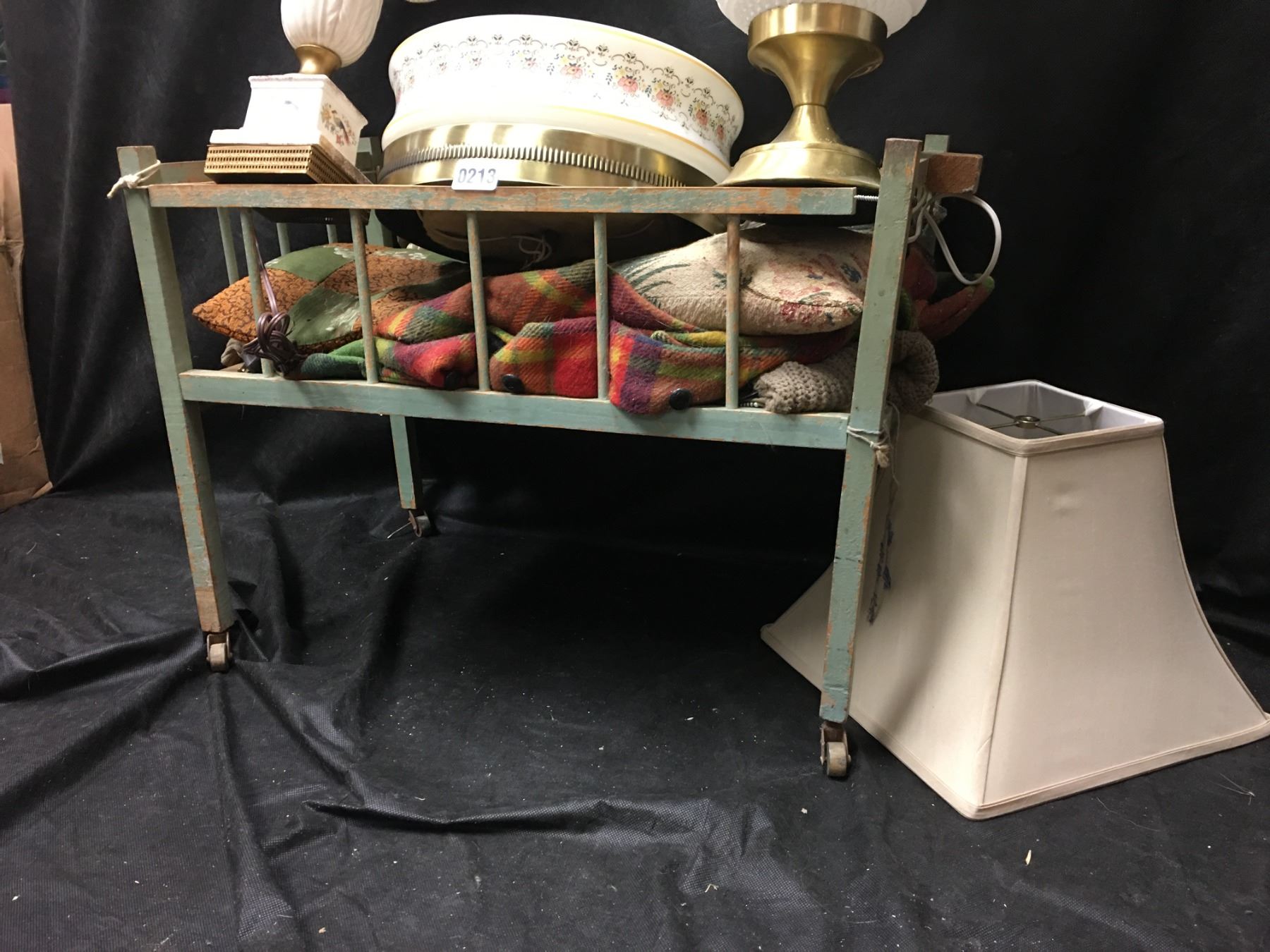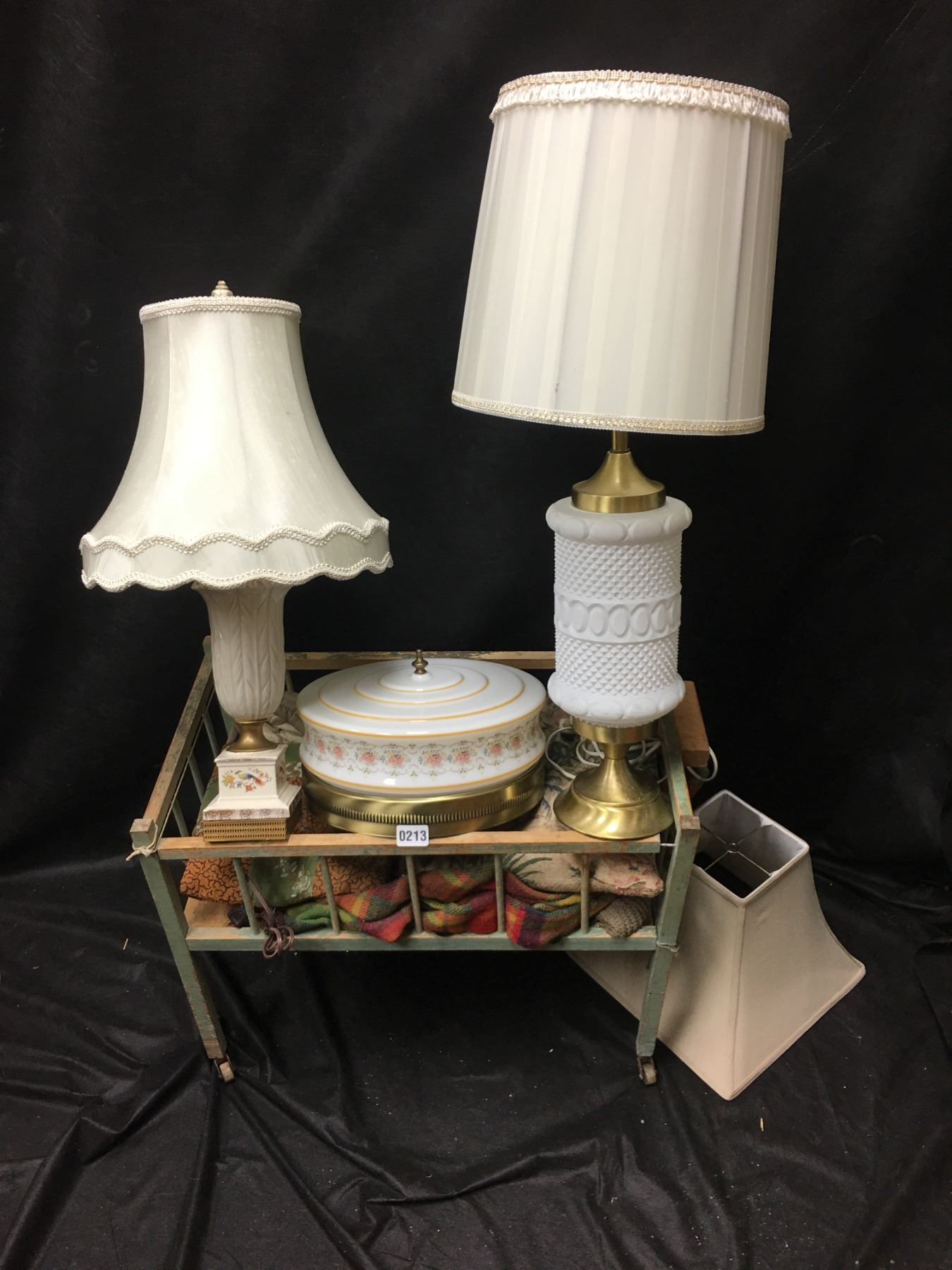 3 Table Lamps, Ceiling Light & Wood Doll Bed