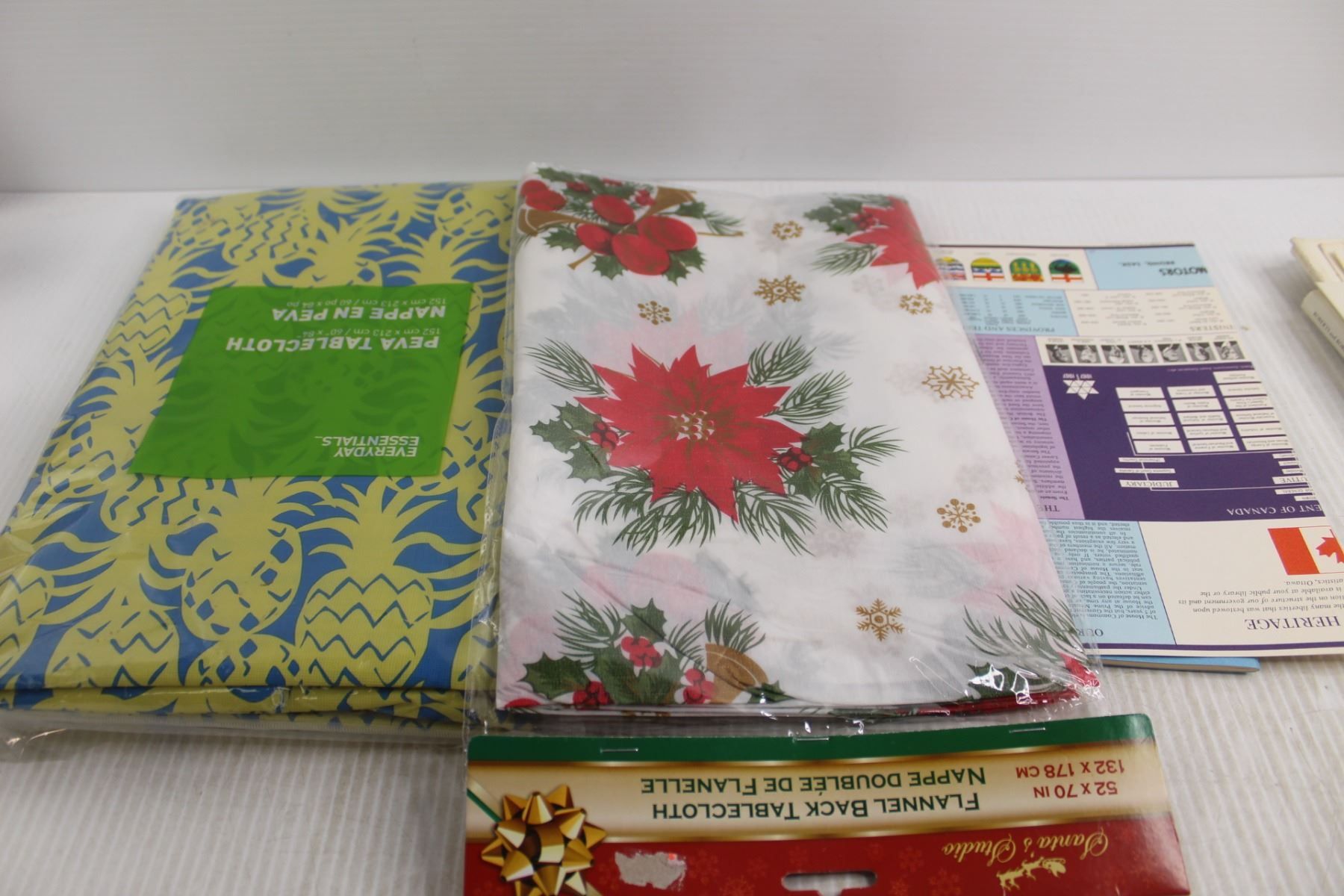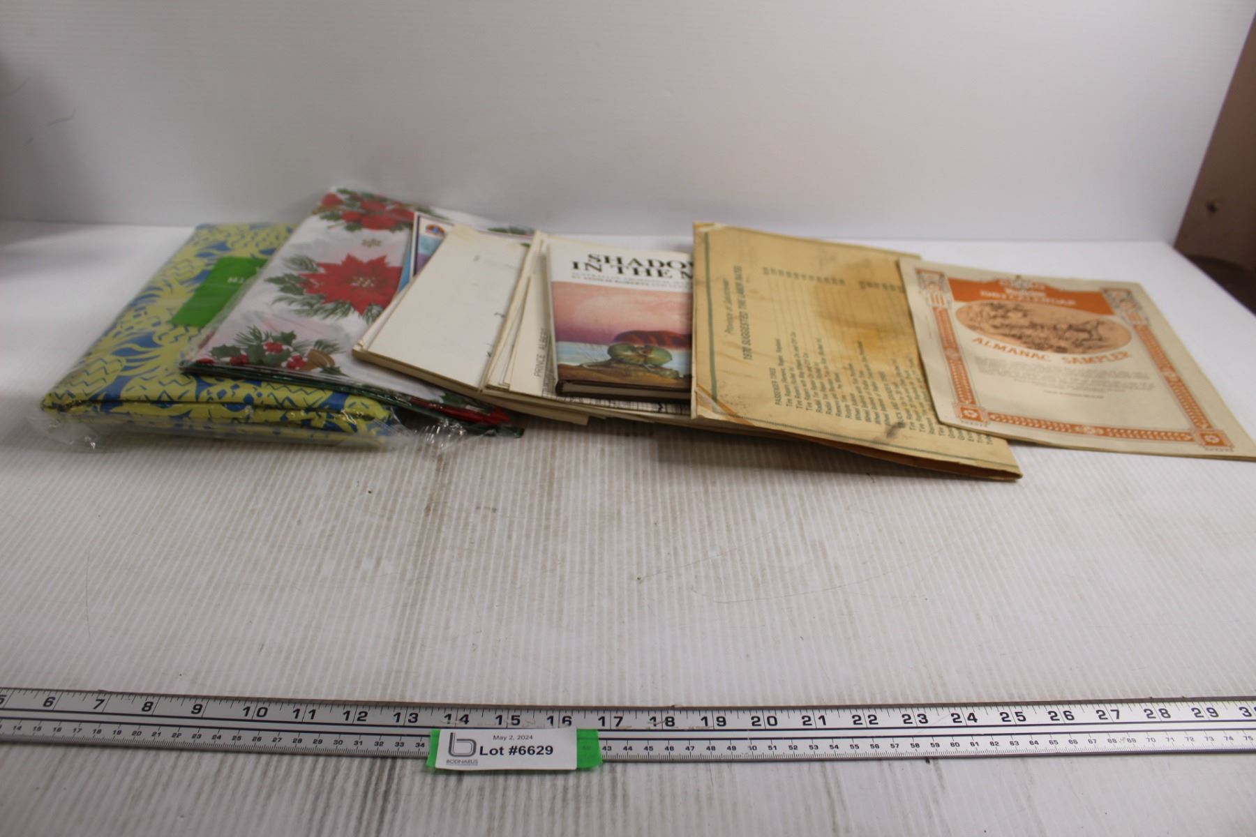 (2) Tablecloths, Shadow in the Mist Book, Assorted Papers