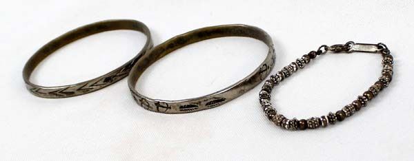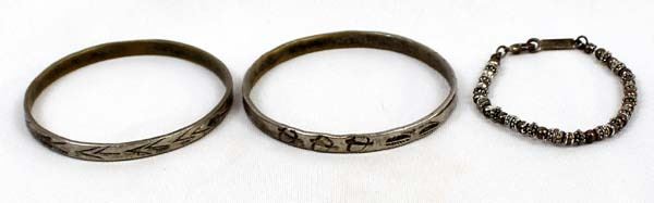 2 Taxco Sterling Bangle Bracelets and 1 Bead Bracelet, bangles measure 2.75''D, bead bracelet measures 7.25''L end to end, the bangles have a total gram wt. of 38.27 and are hallmarked