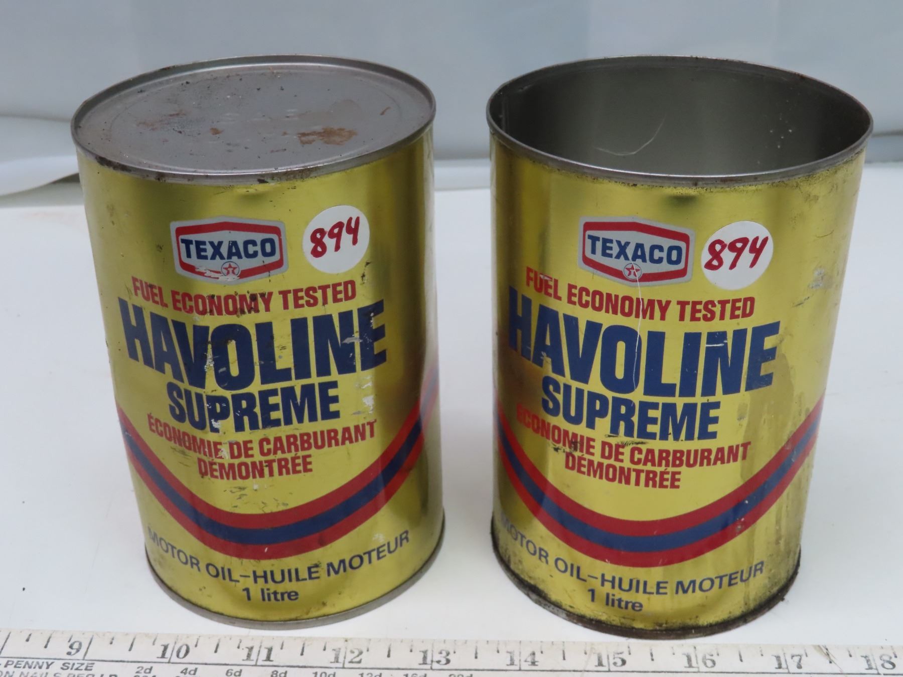 2 Texaco Havoline Supreme 1 Litre Tins - 1= Full, 1= empty