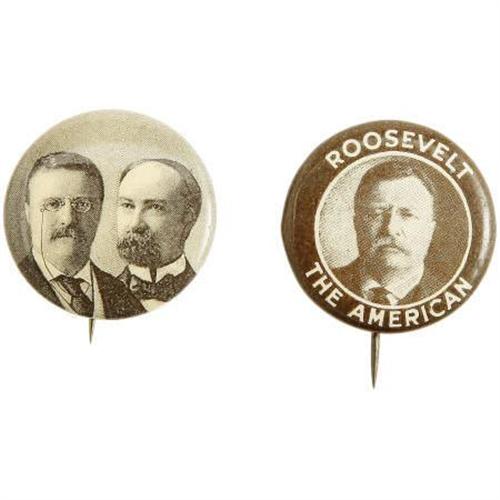 <B><B>Two Theodore Roosevelt 1904 Presidential Campaign Buttons,</B></I></B></I> including: a Roosevelt and Fairbanks jugate button with full backpaper and a “Roosevelt The American” button. Both buttons are 7/8”, sepia, and fine.<BR><BR><BR><b>Shipping:</b> Miscellaneous Collectibles, Smal (<a target="_blank" href="http://www.heritageauctions.com/common/shipping.php">view shipping information</a>)