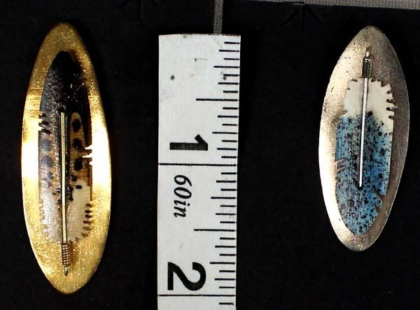 2 Tie Tacks by Ron English. The longest, which is brass, measures 2'' in length, feather motif, FYI: “Ron English born in 1959 is an American contemporary artist who explores brand imagery, street art, and advertising.”