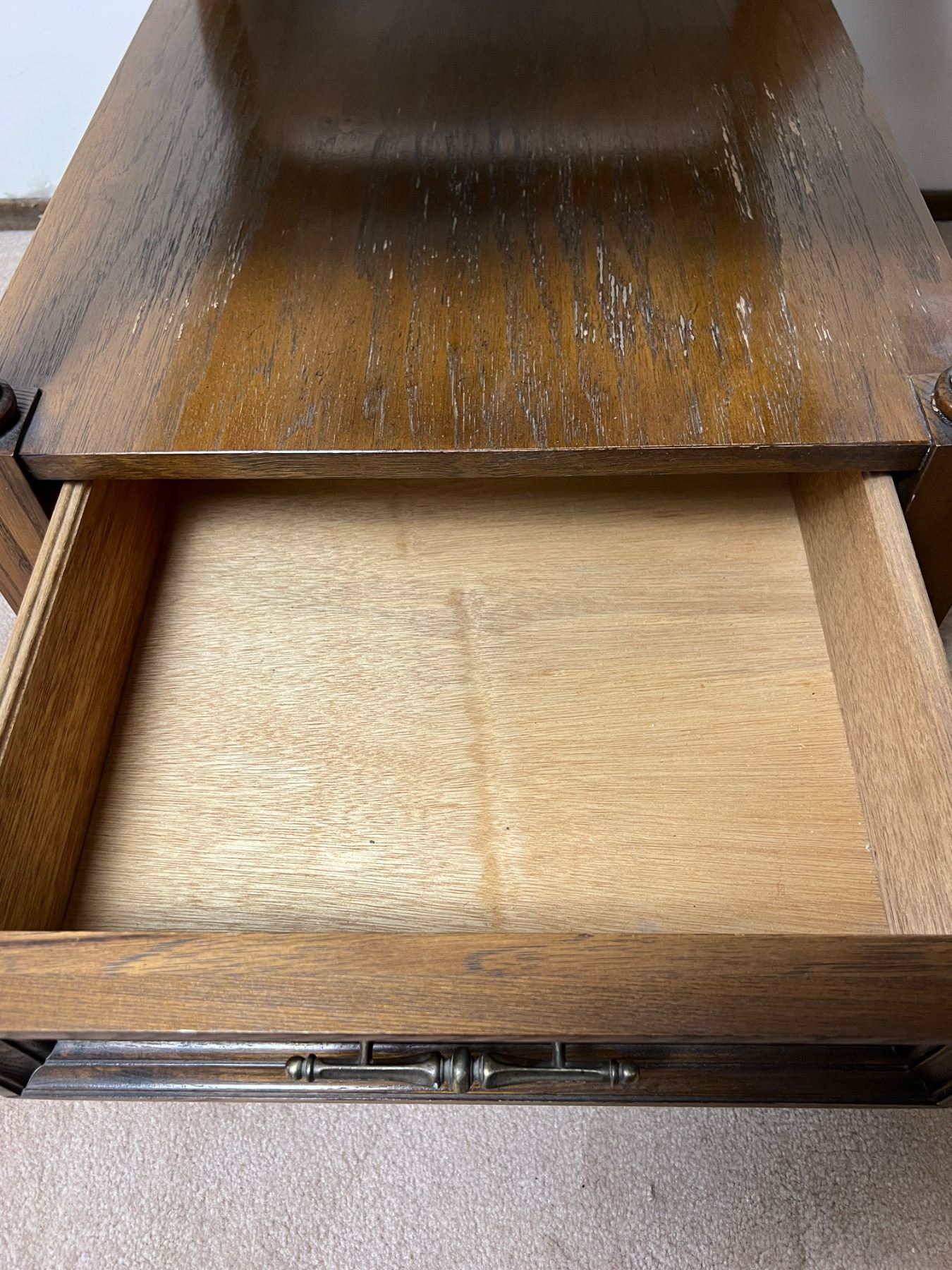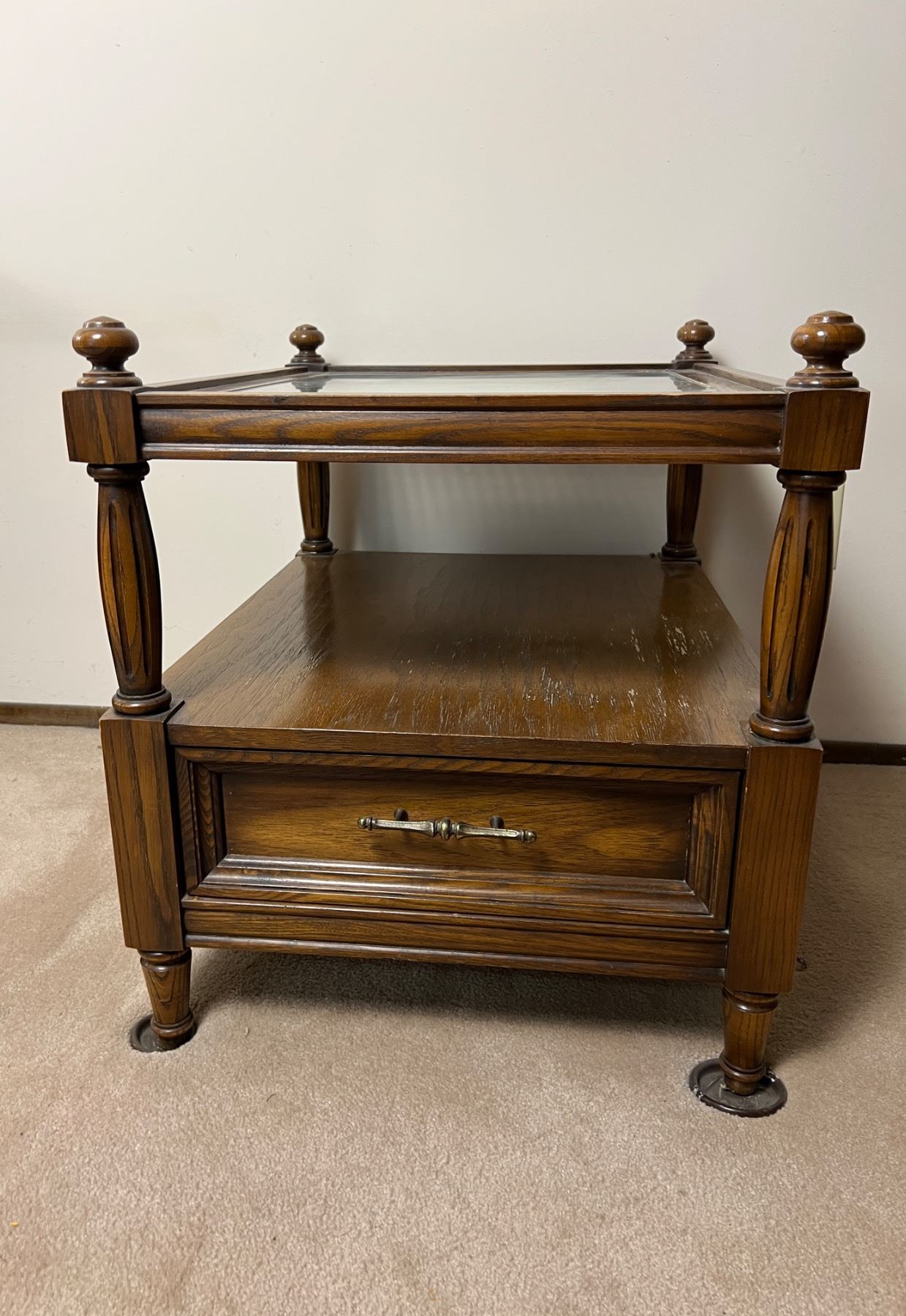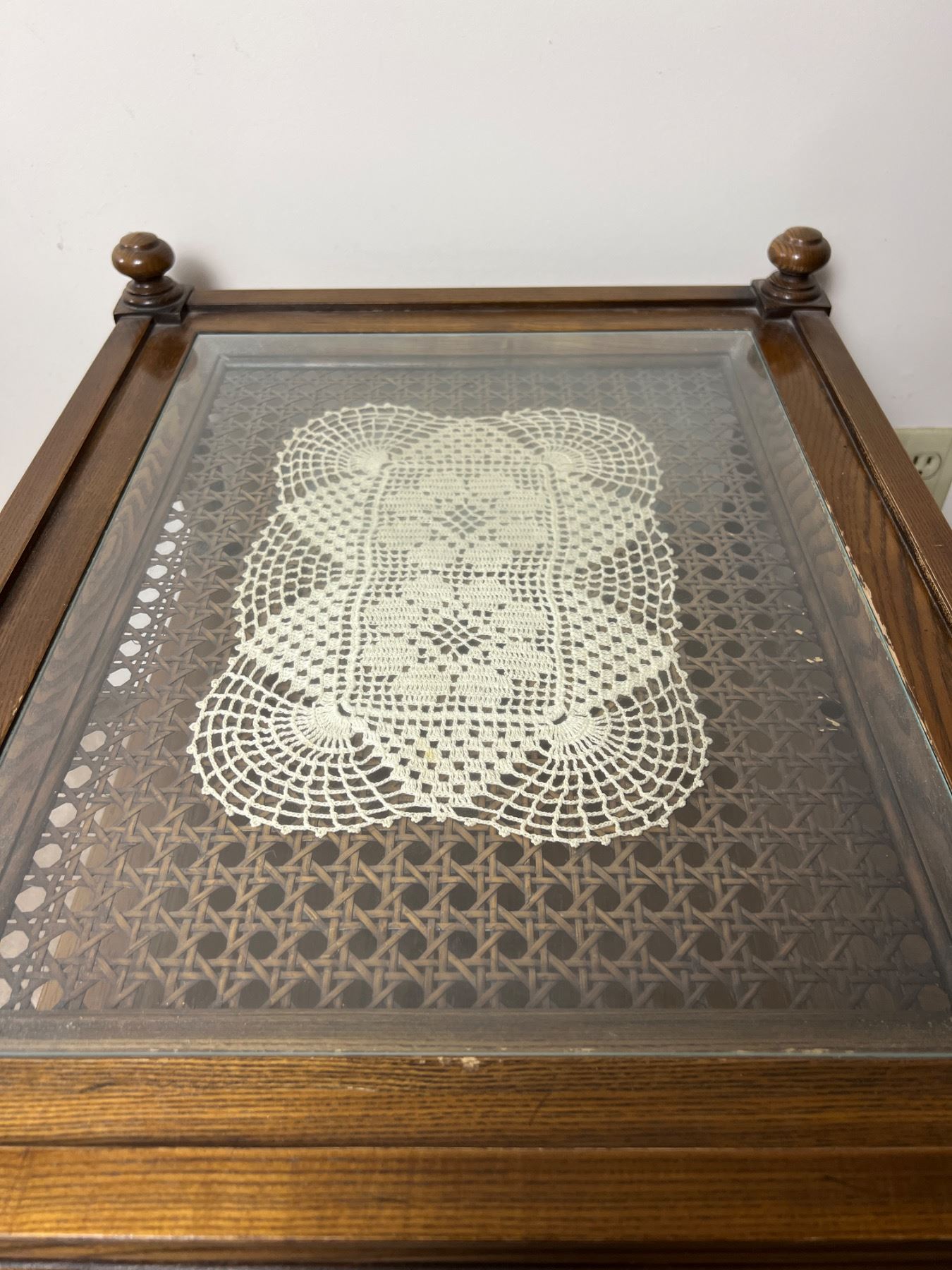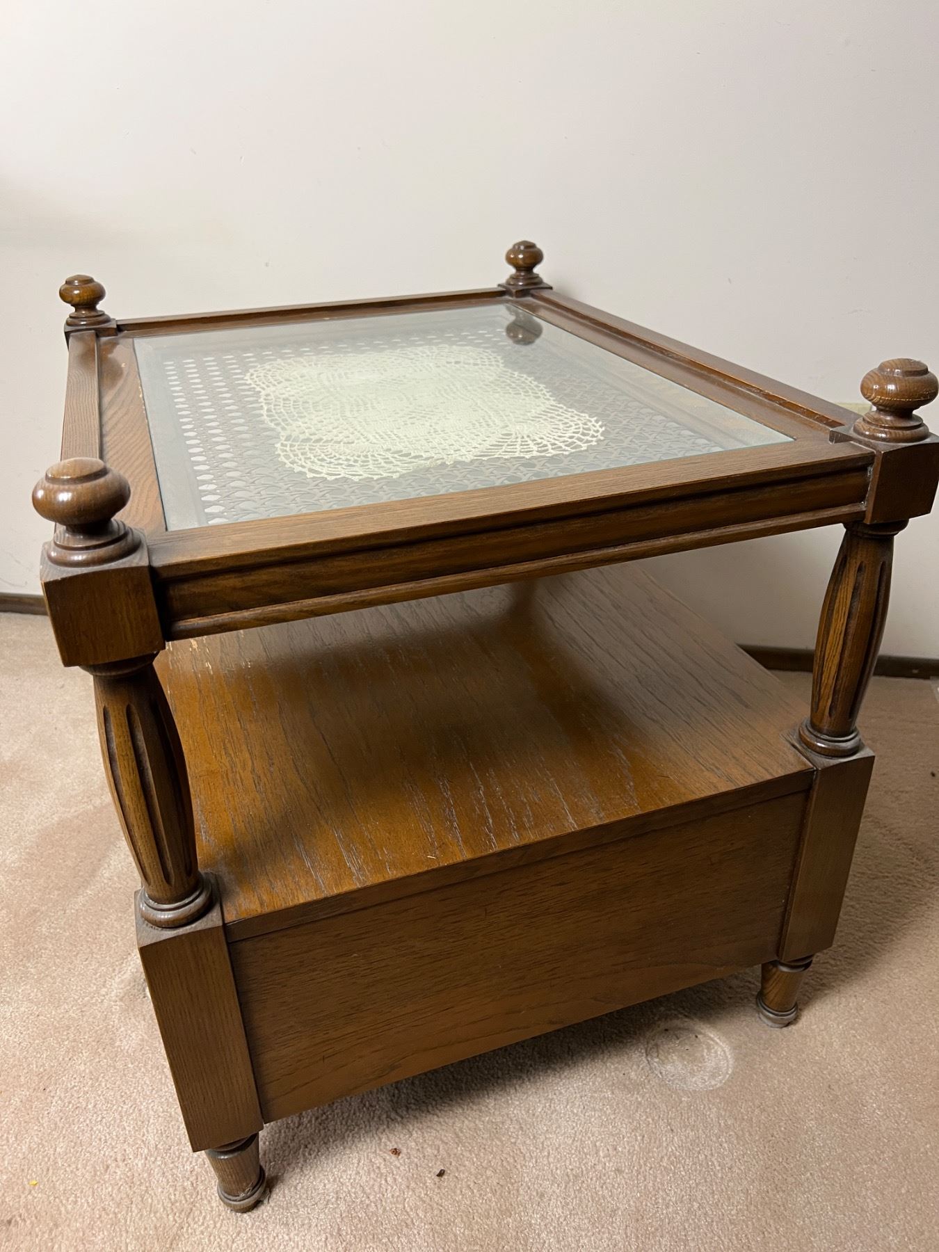 Has some marks to wood surface. Glass has stains from dust buildup.