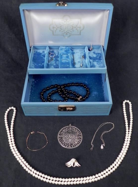 Here is a jewelry box with some assorted jewelry included. The box is two tiered, with smaller shelf, and hinged lid. The interior is velvety lined, and the exterior is vinyl. There are some spots but this is sticker residue that can be cleaned off. The b