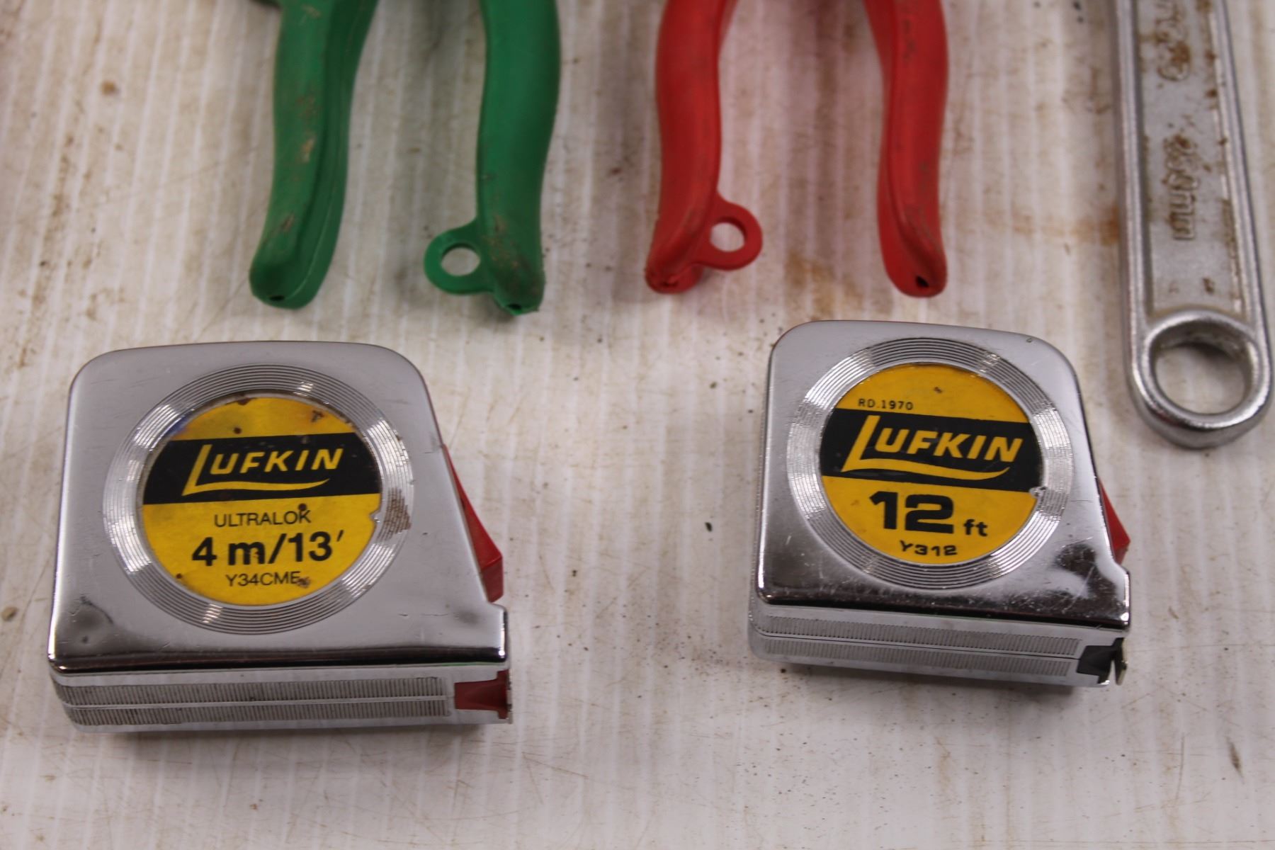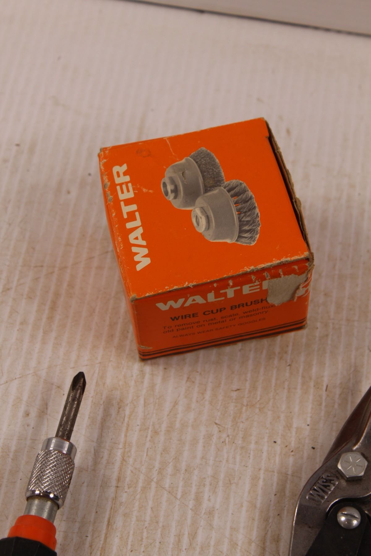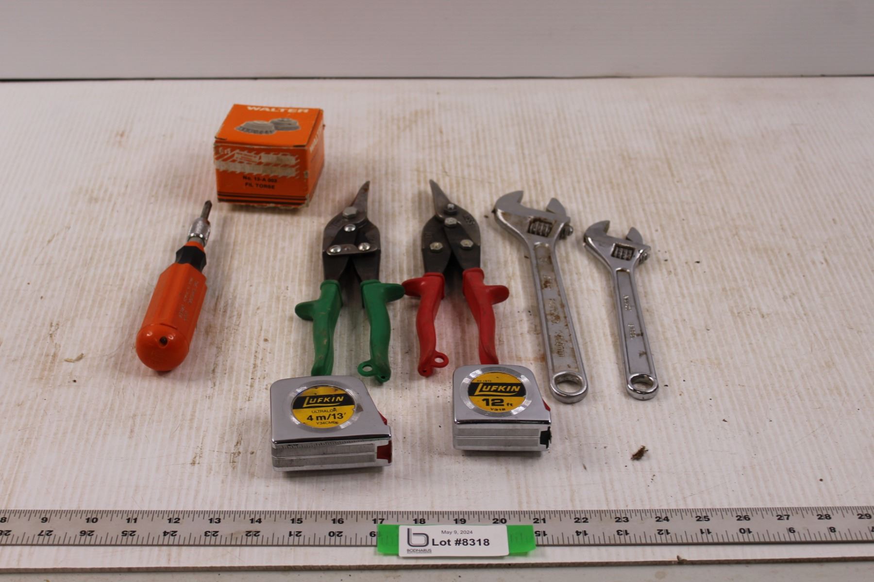 (2) Tin Snips (WISS M1 & M2), (2) Adjustable Wrenches, (2) Lufkin Tape Measures (12' & 13') Multi Screwdriver & Walter Wire Cup Brush