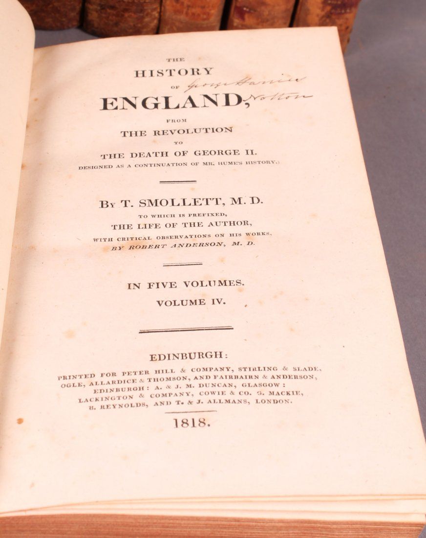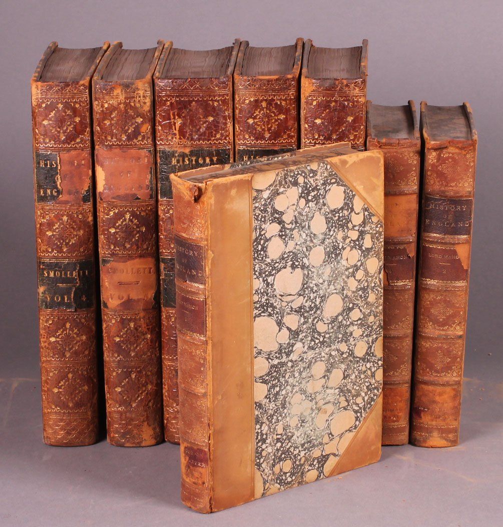 [British History]. 2 Titles (8 Vols). ++ T. [Tobias] Smollett. THE HISTORY OF ENGLAND, From The Revolution To The Death Of George II. (Designed as a Continuation of Mr. Hume?s History.) 5 Vols. Edin: Peter Hill & Company, Stirling & Slade, Ogle, et. al., 1818. 8vo. Vol I: [2], 175, [Errata page], 514pp. Vol II: [2], 574pp. Vol III: [2], 548pp. Vol IV: [2], 510pp. Vol V: [2], 488pp. Contemp full leather, expertly recased with contemp leather laid down over covers and spines. Marbled eps. Superficial chipping, 4 spine labels lacking, other spine labels loose/chipped. Vol I has soiling to lower corner of p22. Contents very good. ++ Lord Mahon. HISTORY OF ENGLAND from the Peace of Utrecht to the Peace of Versailles. 1713-1783. 3 Vols (of 7): Vols I-III. Lon: John Murray, 1853. Vol I: [4], [iii]-xi, [i], 366, xlvii, [1] pp. Vol II: xi, [i], 284, cxxi pp, Vol II's half title not present. Vol III: xv, [i], 351, [i], liii, [1] pp. 8vo. Half morocco and marbled board by R. W. Smith, aem, marbled eps. Spine labels lacking/loosening at edges, peripheral areas of covers chipped/worn. Texts very good.