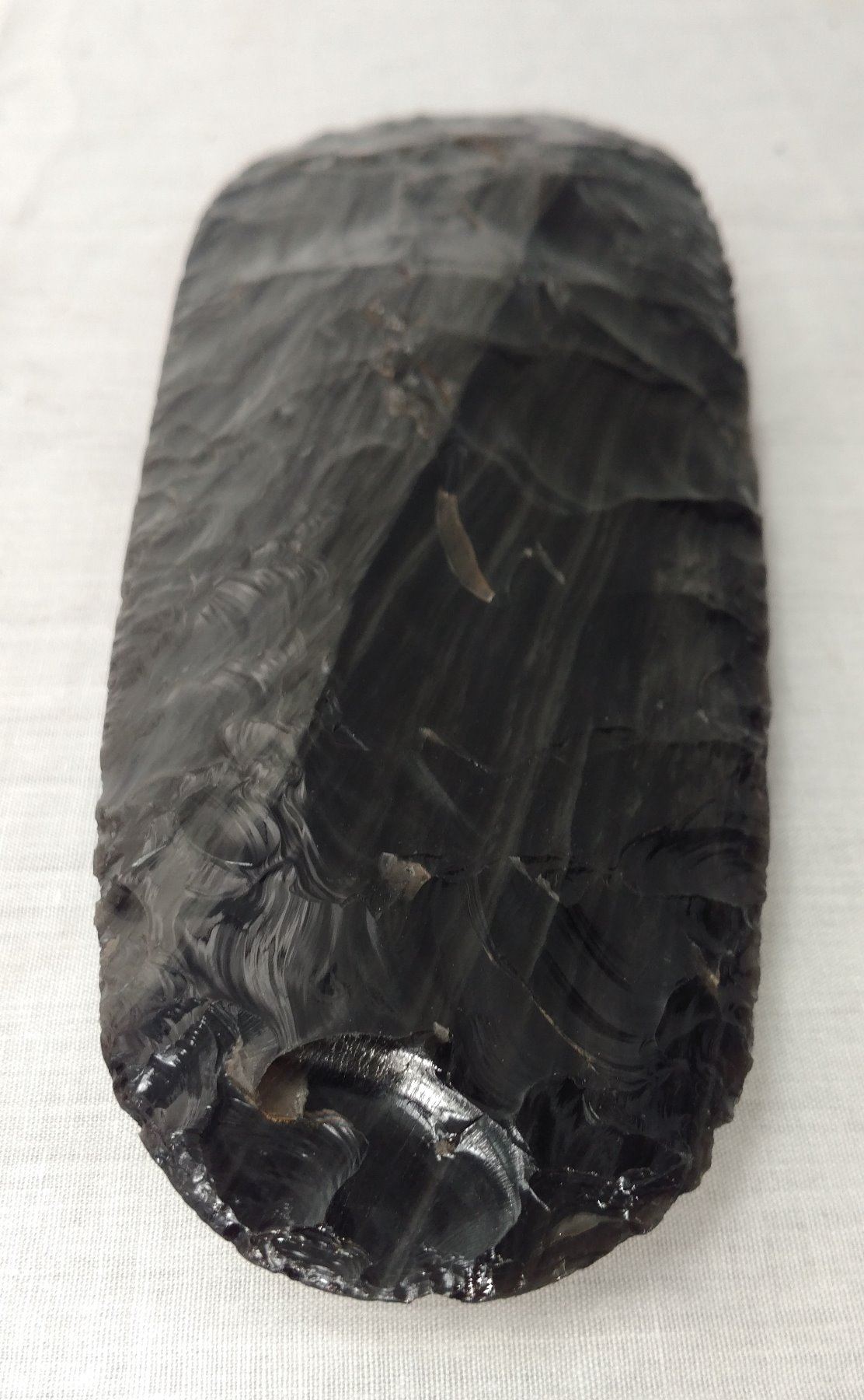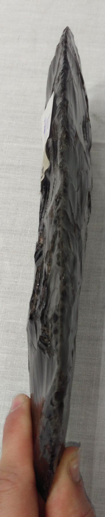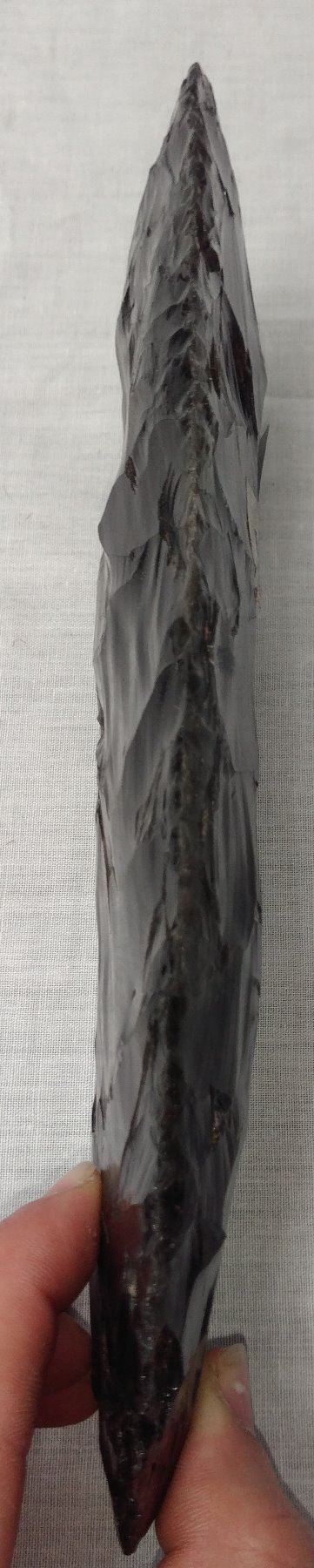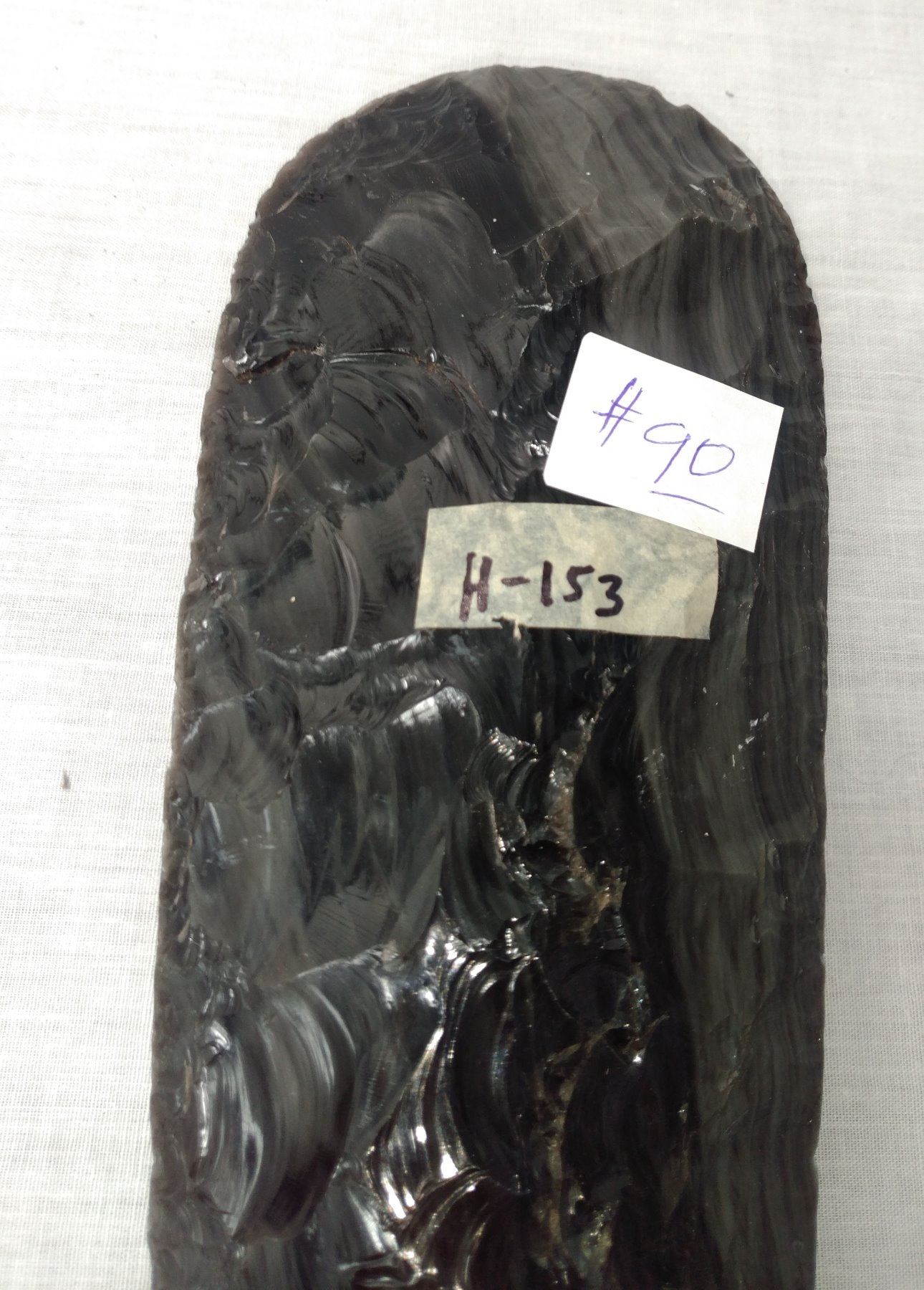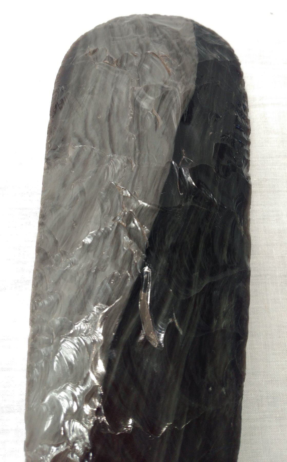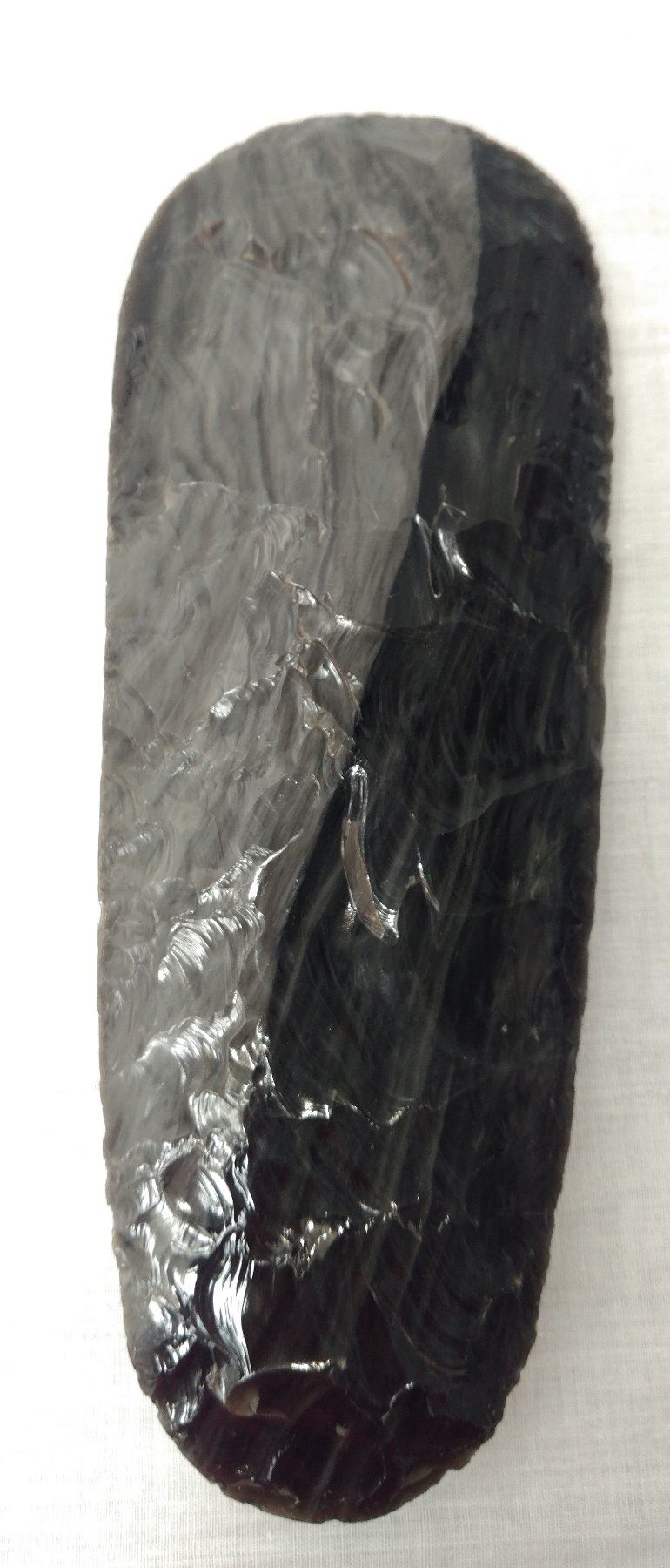 2-Tone Obsidian Blade, early historic item. Made of obsidian, the item measures 10 1/2". Hupa, California. Condition: Good, see images. Shipping: $25.50 w/insurance and signature.