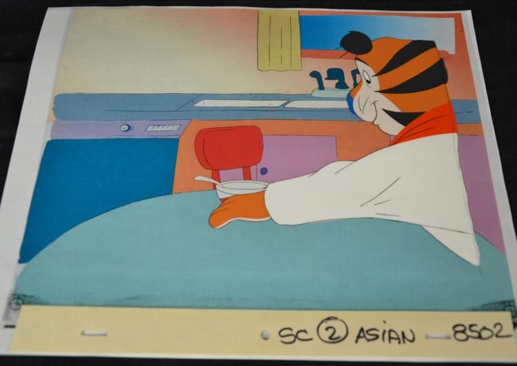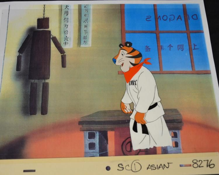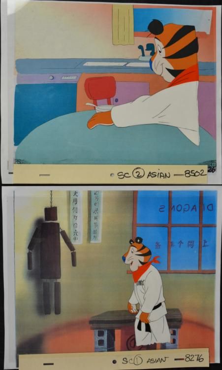 These two original animation cels were used in the production of a cereal commercial seen on television. One shows Tony the Tiger coming back from the karate studio, where he has apparently worked up an appetite, because in the other cel he is reaching for a bowl Frosted Flakes. * Medium: Hand painted cel acetate with printed backgroundSheet size: 11 x 13 inchesDetails: Paper with peg holes and animator notations taped onto the lower edgeCondition: Excellent