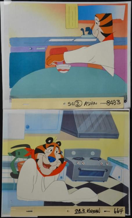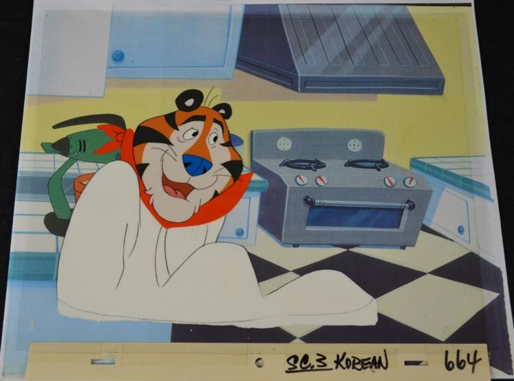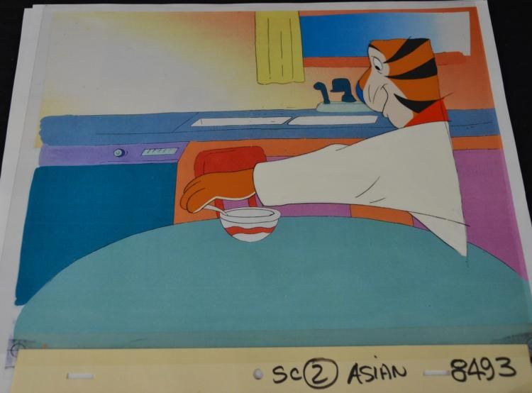 Here are two original animation cels that were used in the production of a cereal commercial seen on television. One shows Tony the Tiger in the kitchen in his karate uniform, and in the other he is reaching for a bowl of his favorite cereal- Frosted Flakes, of course! * Medium: Hand painted cel acetate with printed backgroundSheet size: 11 x 13 inchesDetails: Paper with peg holes and animator notations taped onto the lower edgeCondition: Excellent