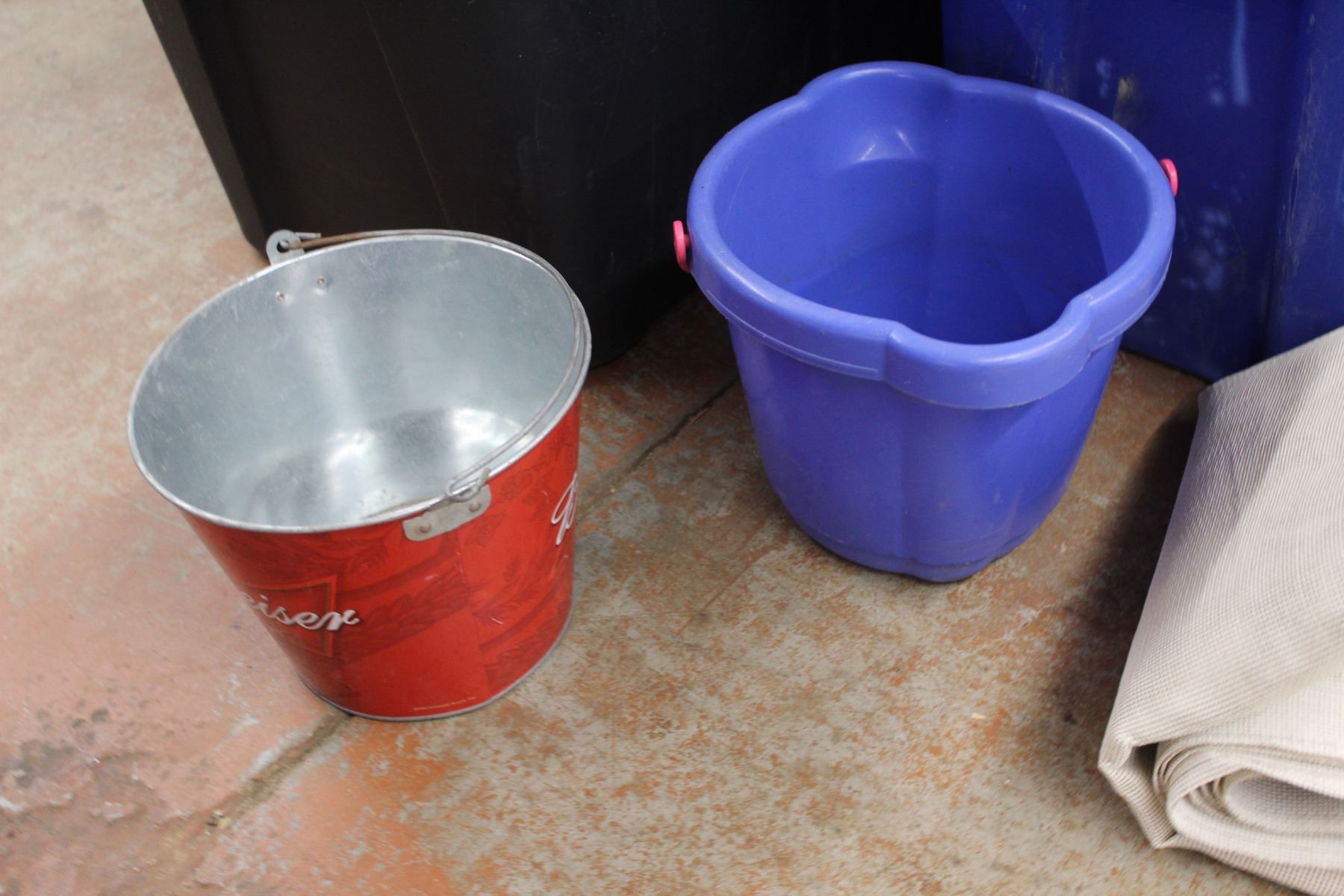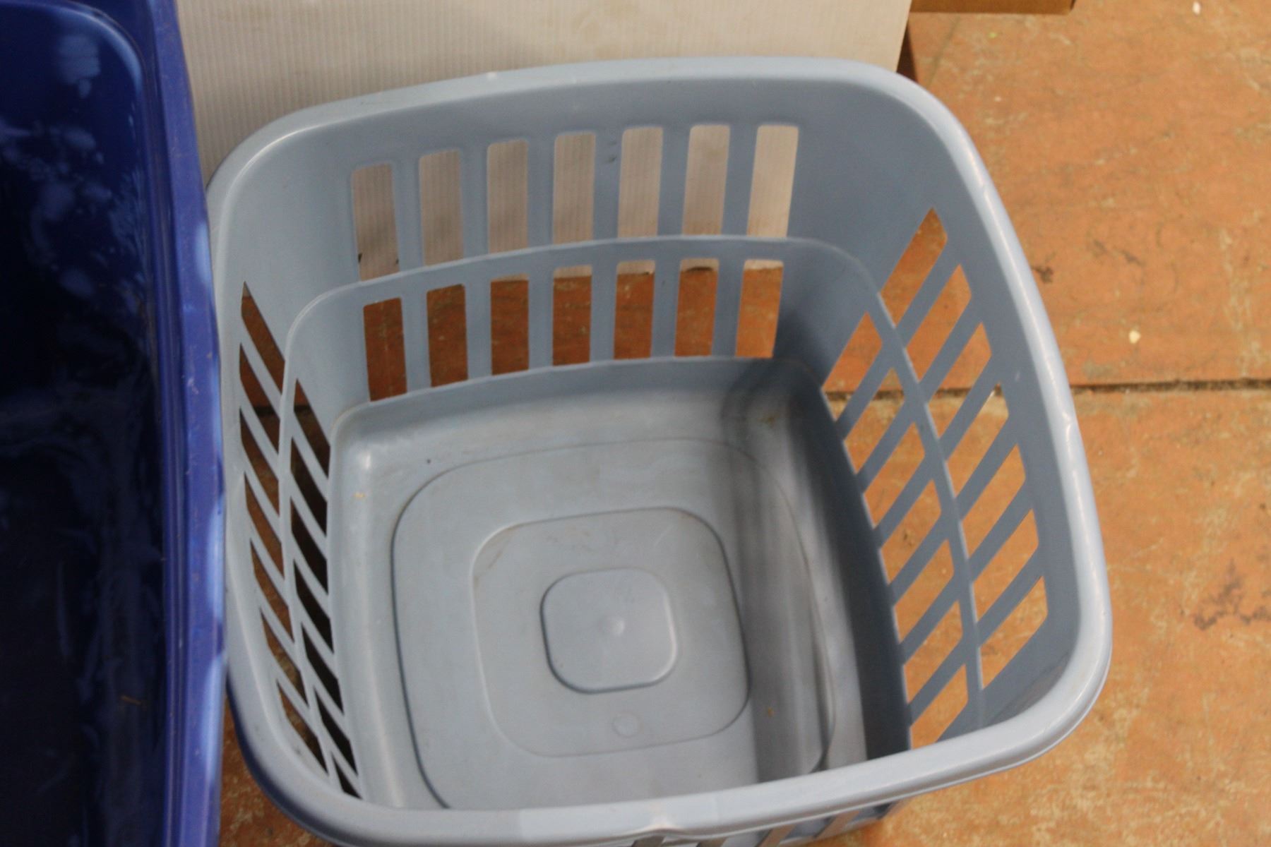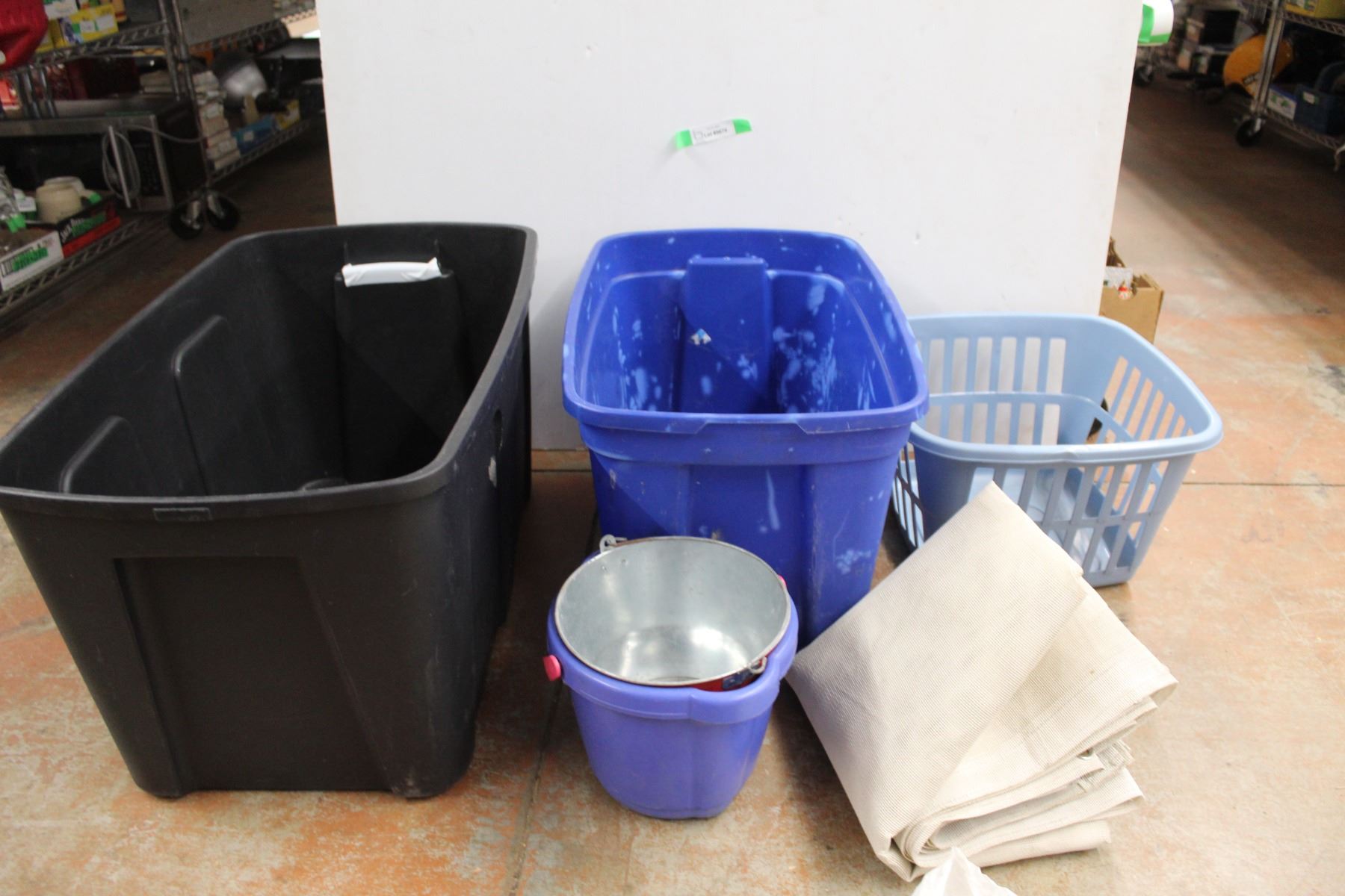 * (2) Totes, Laundry Hamper, Curtain, (2) Buckets
