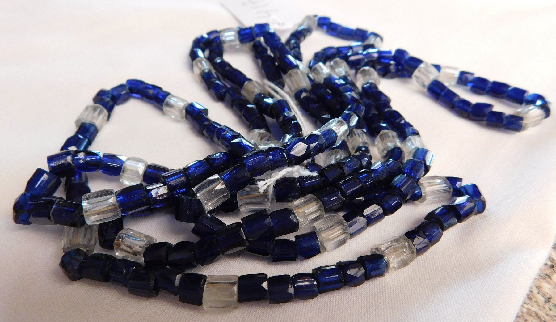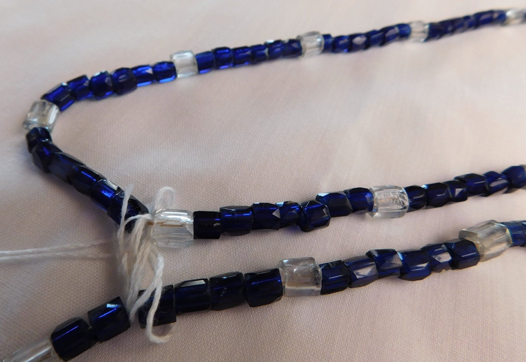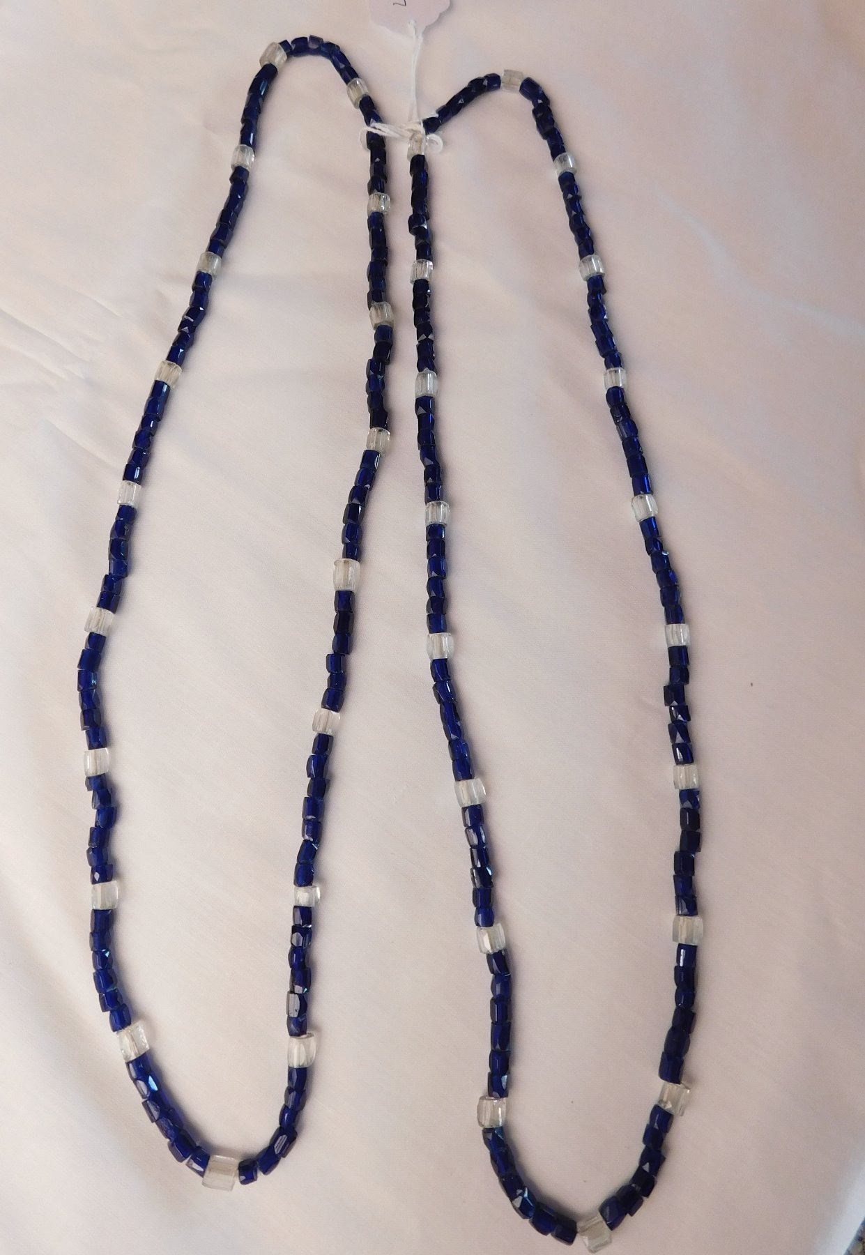 2 Trade Bead Necklaces, c. 19th century items. Made of glass and string, the items hang about 14" as worn. European. Condition: Good, see images. Shipping: $12.00 w/insurance and signature.