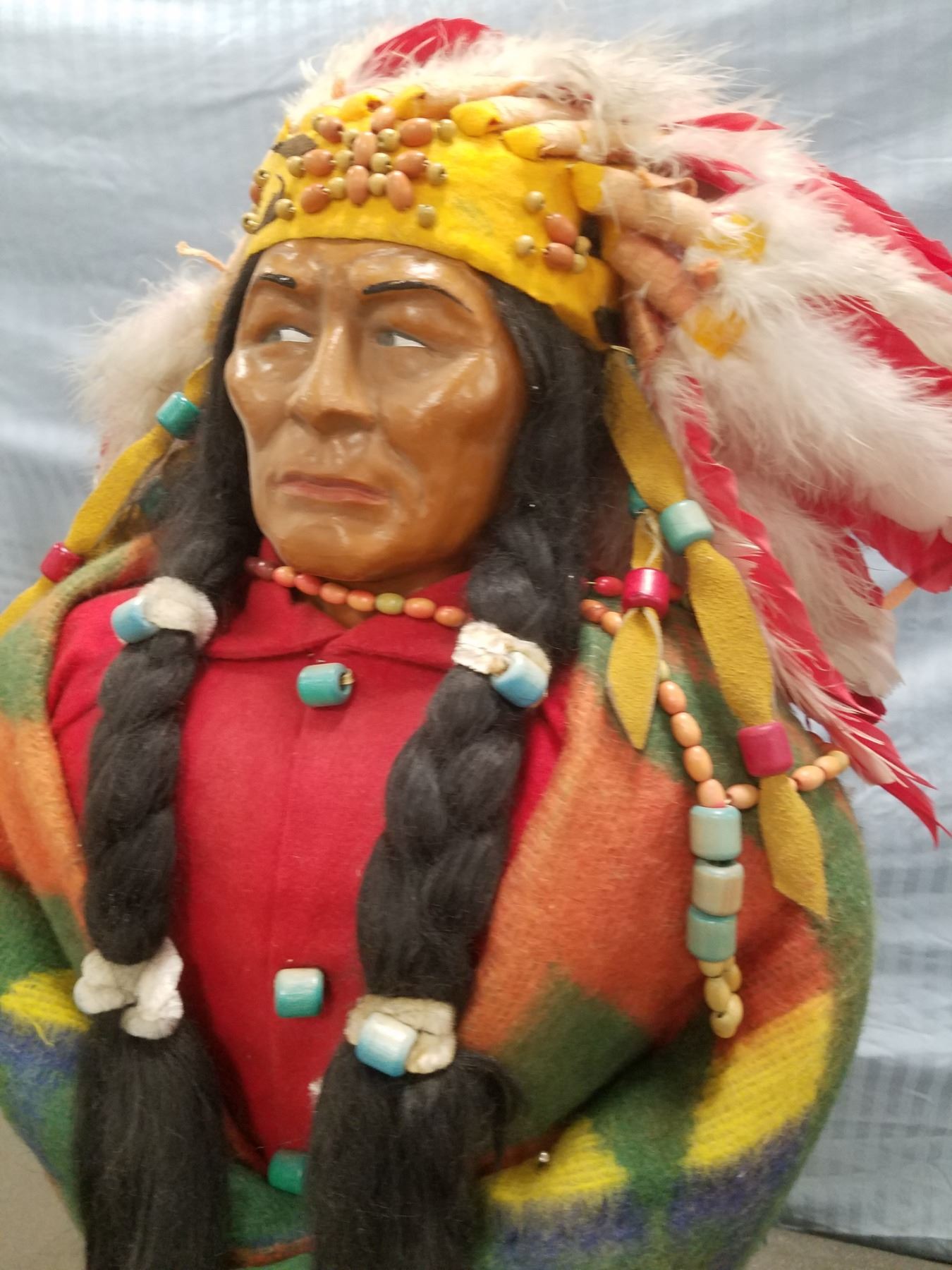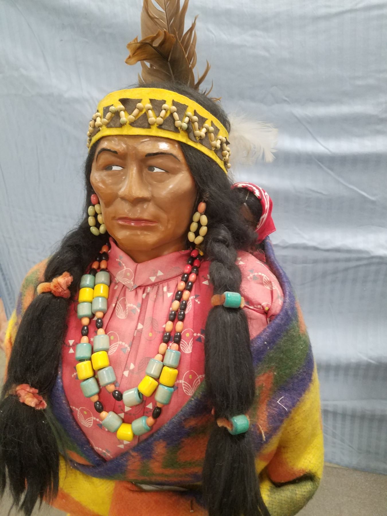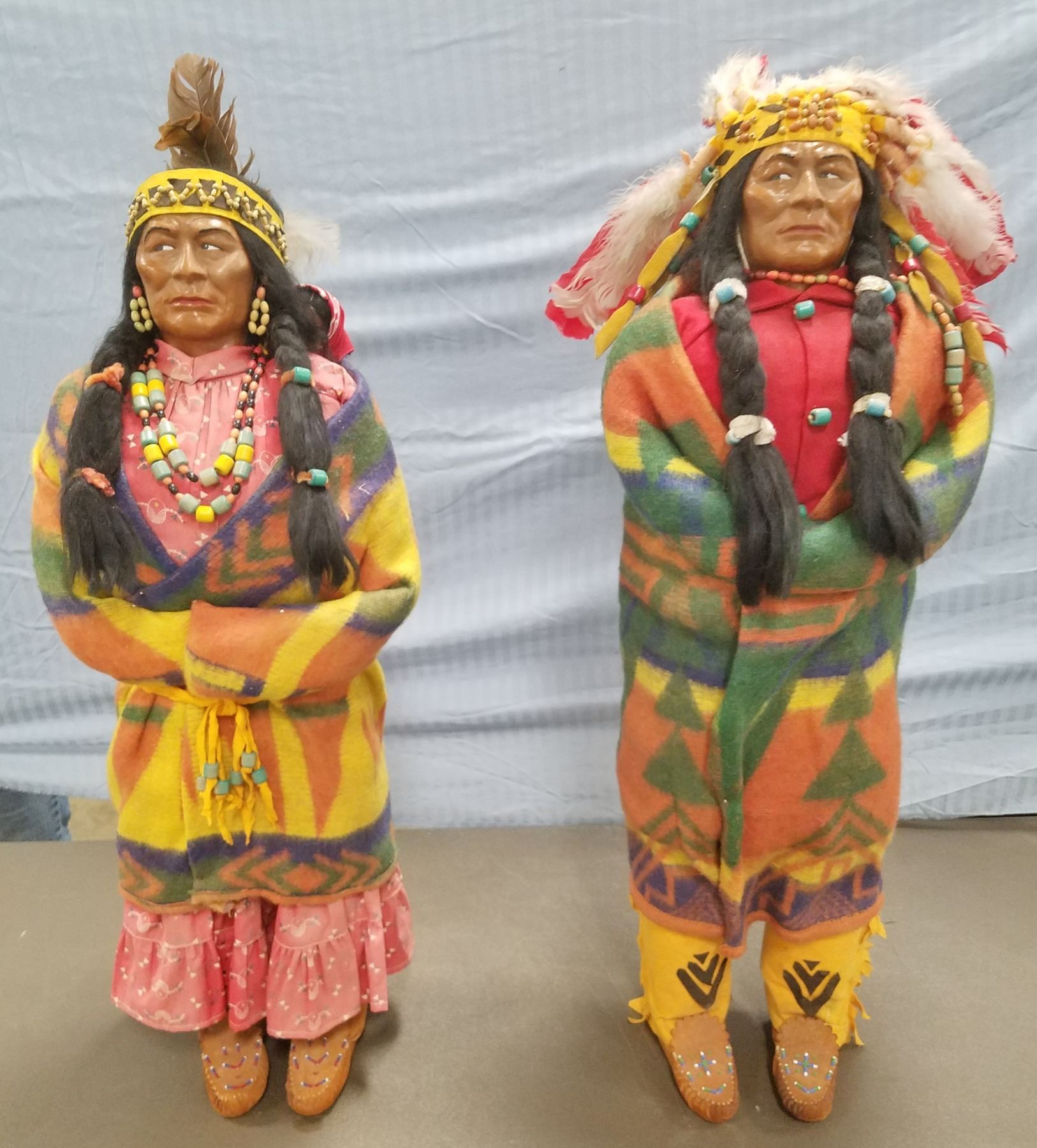 (2) Trading post Indians, c. 1950's, chief & woman w/ papoose & baby, 35"h (Chief), 32"h (Maiden), composition, excellent condition