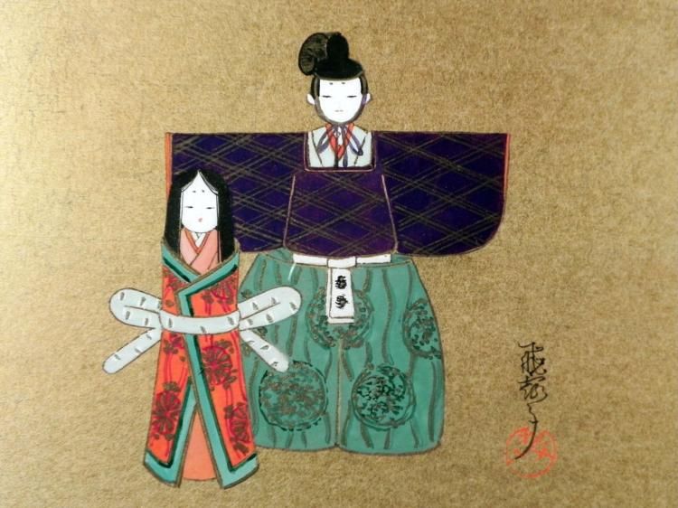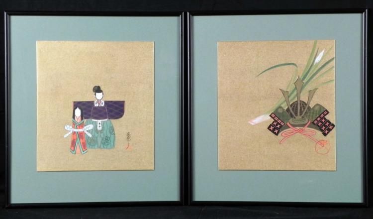 These two paintings portray traditional Chinese figures and costumes.Artist: Characters marked on each, lower rightMedium: Painting on gold paperSheet size: 9 1/2 x 10 3/4 inchesPresentation: On sea green background, in black plastic framesFrame size: 14 1/2 x 16 inchesAdditional: Chinese tags on the reverse sidesCondition: Excellent