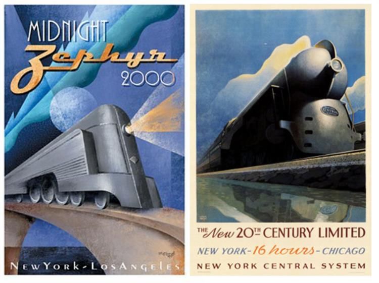 2 Advertising Posters with trains * * * Title: Midnight Zephyr 2000Artist: Michael KunglMedium: Lithograph on paperPaper size: 39 1/2 x 28 inches * * * Title: The New 20th Century LimitedArtist: Leslie RaganMedium: Lithograph on paperPaper size: 36 x 24 inches * Condition: Excellent *