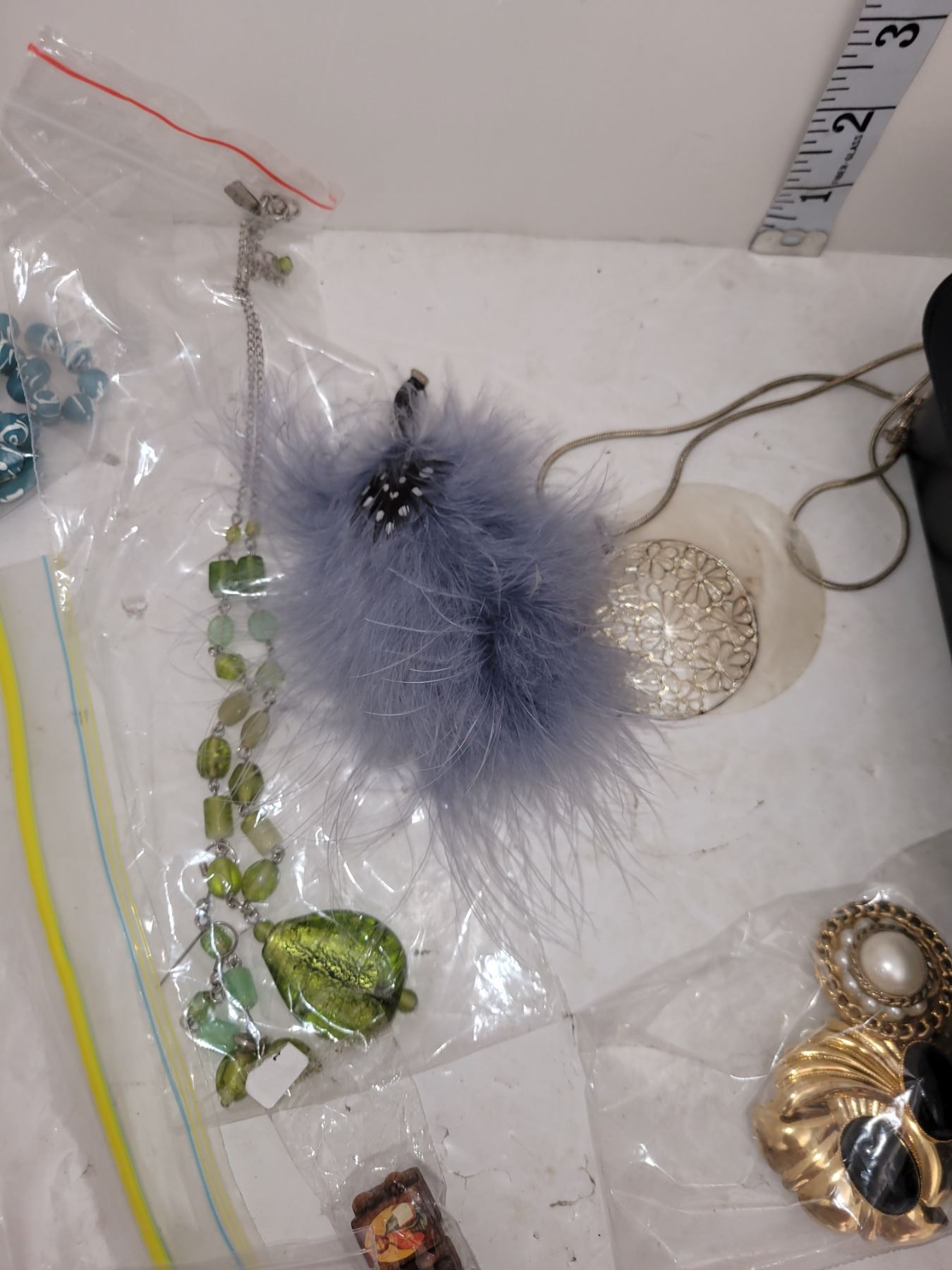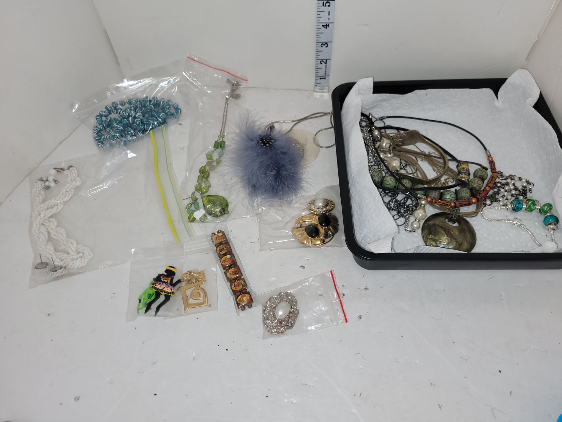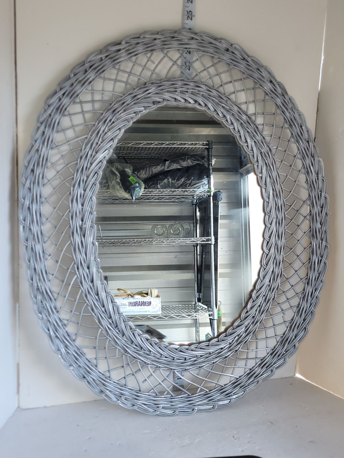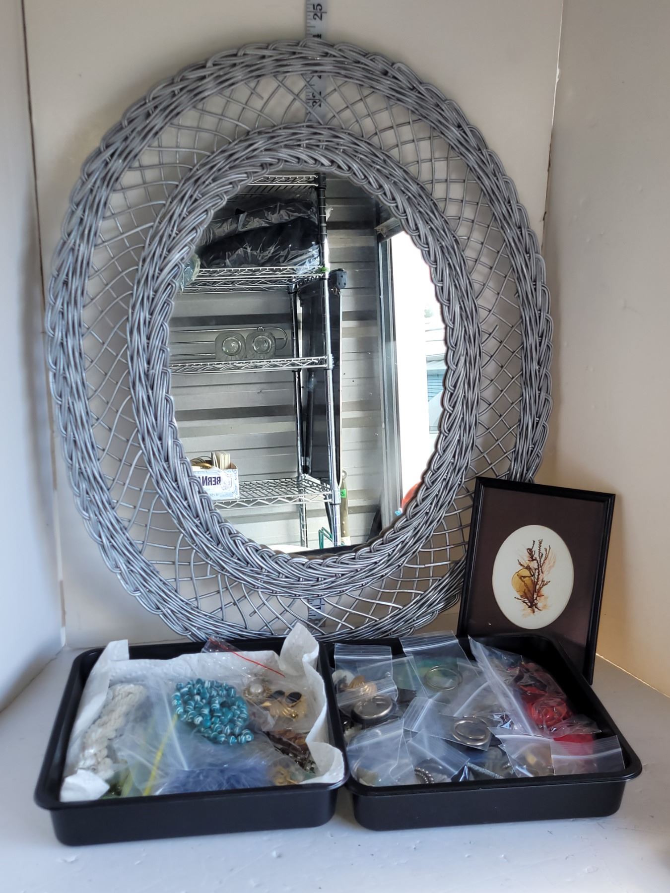 2 trays of costuem jewellery, somes 80s and beyond. Silver colour wicker oval mirror, 20"w x 5.5"h, paint to your liking. 5 black plastic oval picture frames. 1 framed seaweek picture.