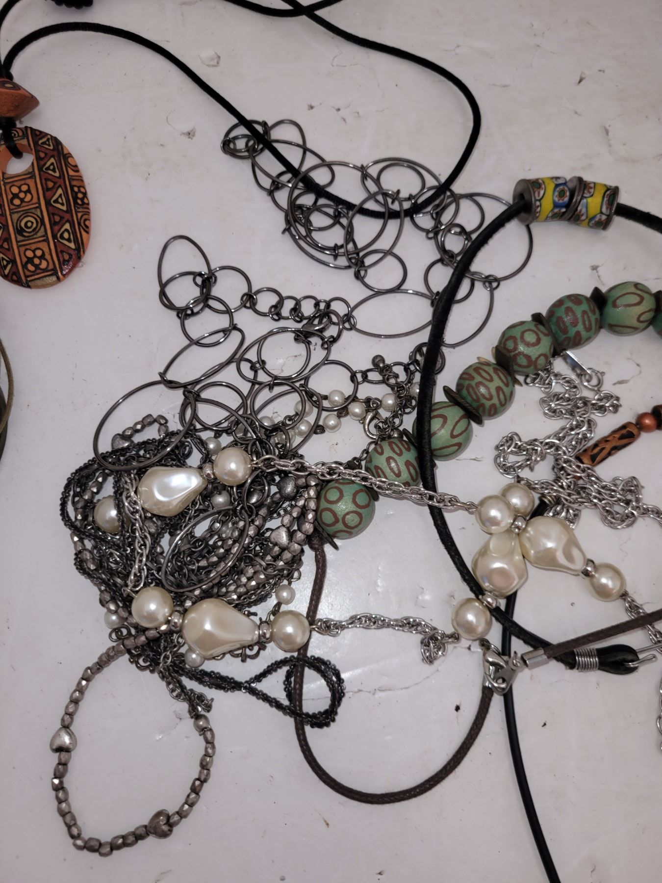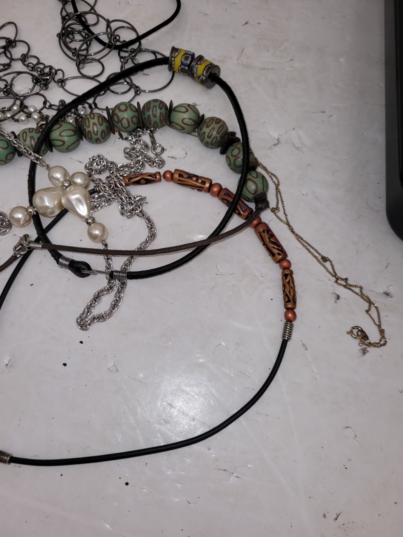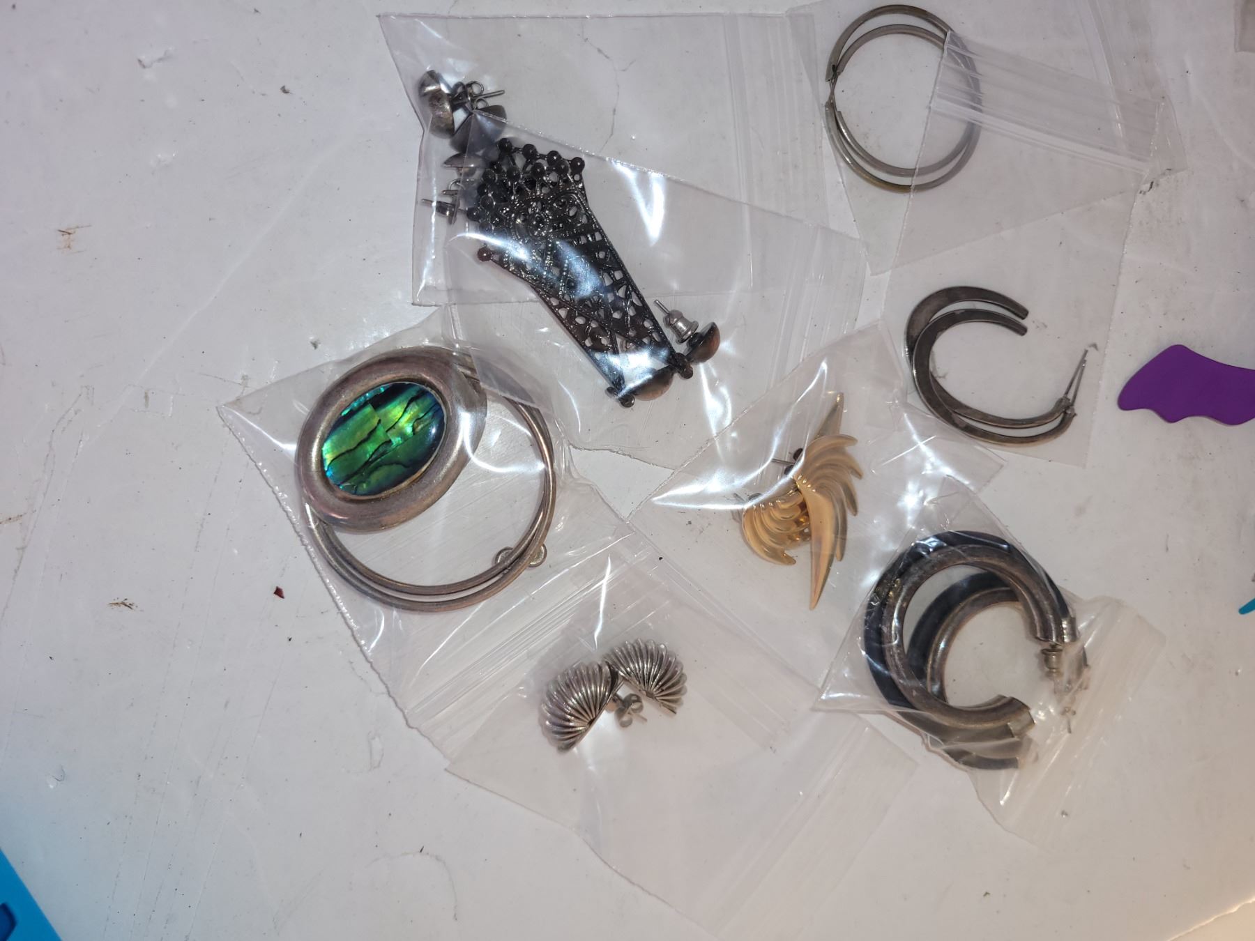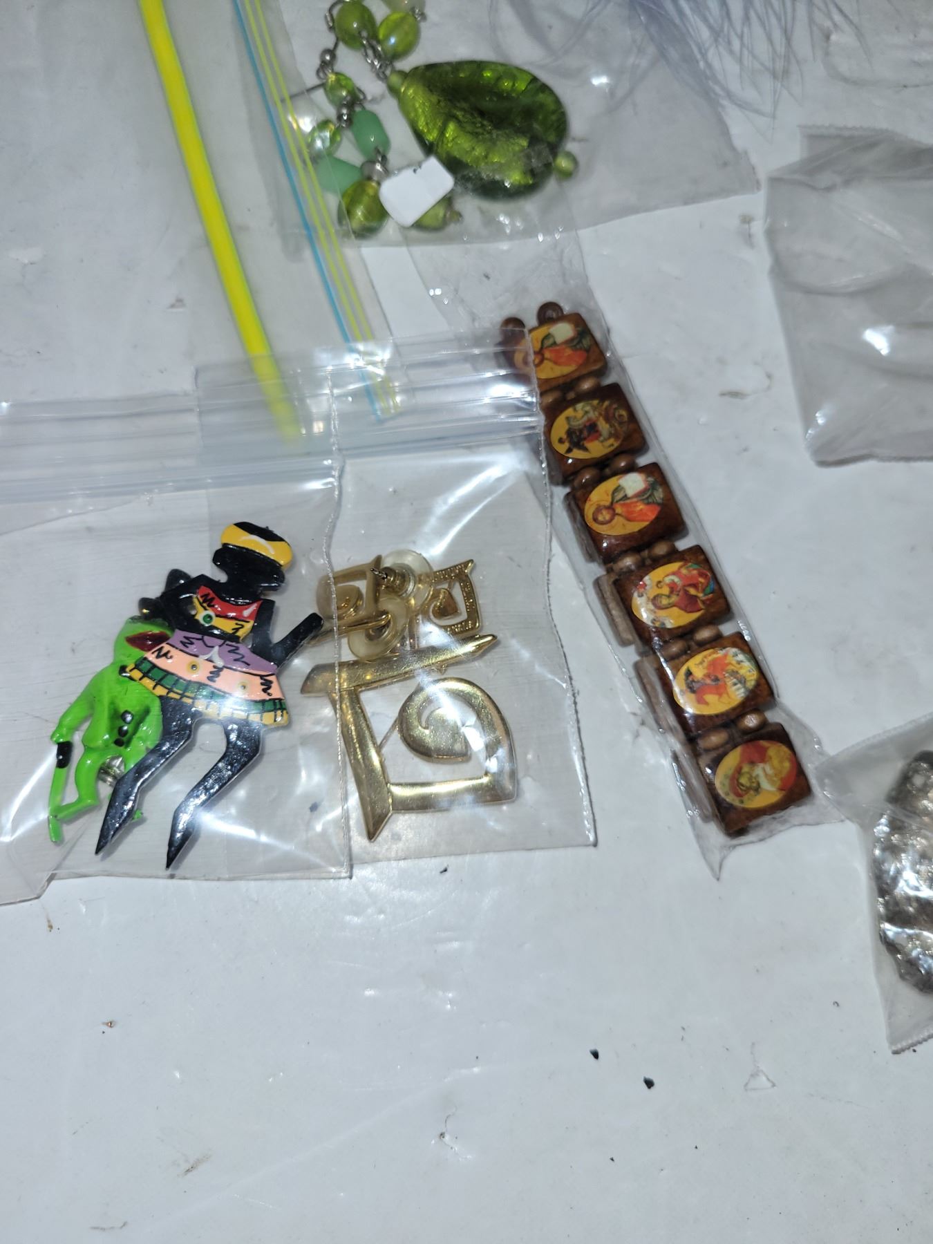 2 trays of costuem jewellery, somes 80s and beyond. Silver colour wicker oval mirror, 20"w x 5.5"h, paint to your liking. 5 black plastic oval picture frames. 1 framed seaweek picture.