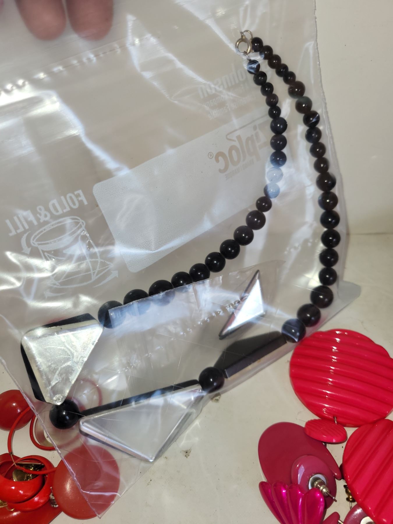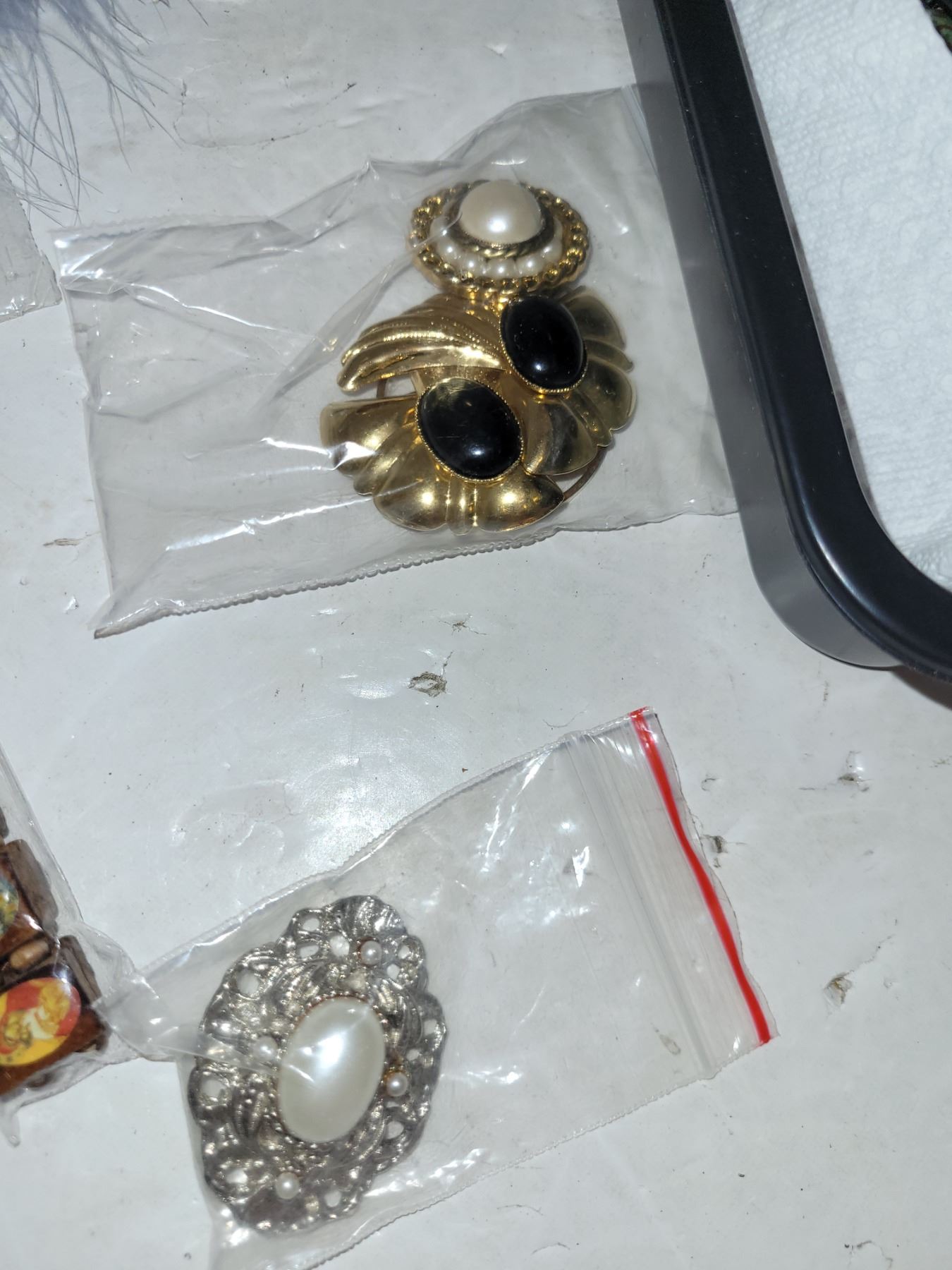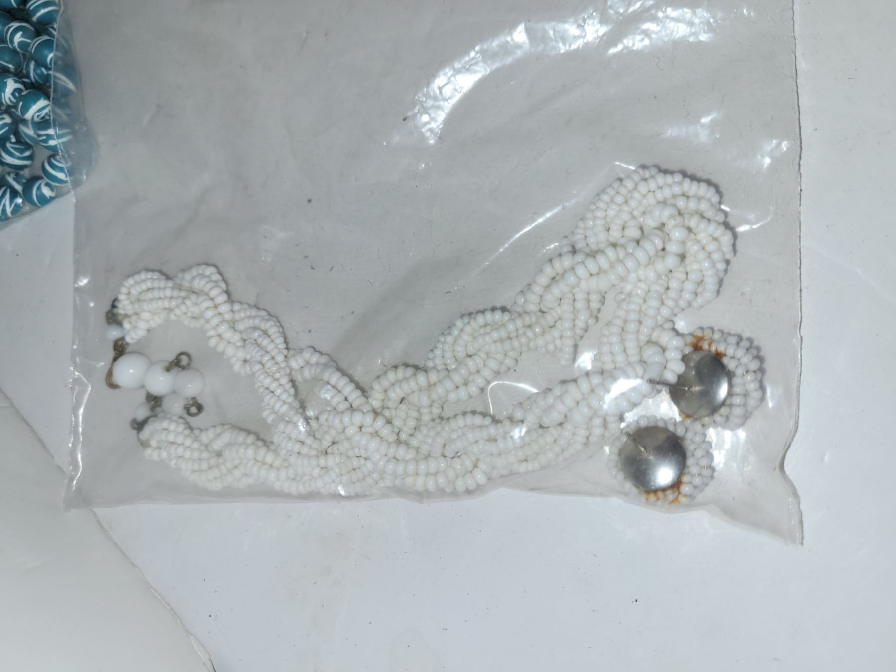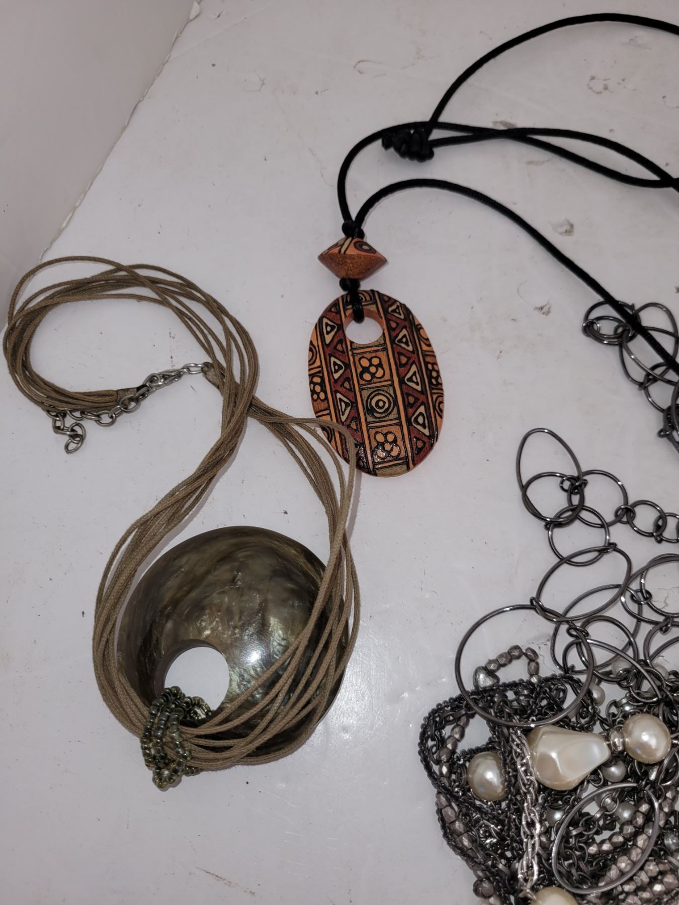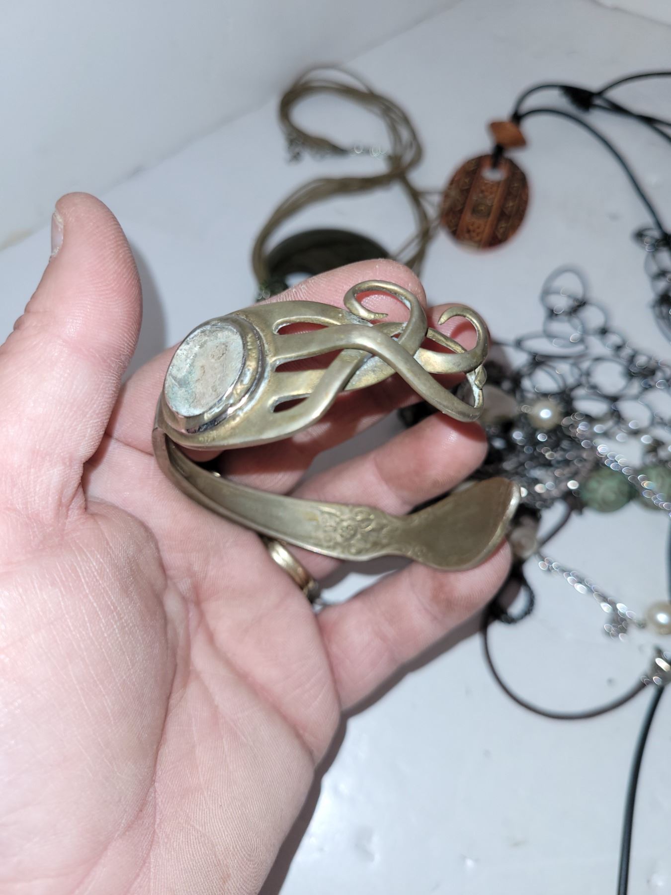 2 trays of costuem jewellery, somes 80s and beyond. Silver colour wicker oval mirror, 20"w x 5.5"h, paint to your liking. 5 black plastic oval picture frames. 1 framed seaweek picture.