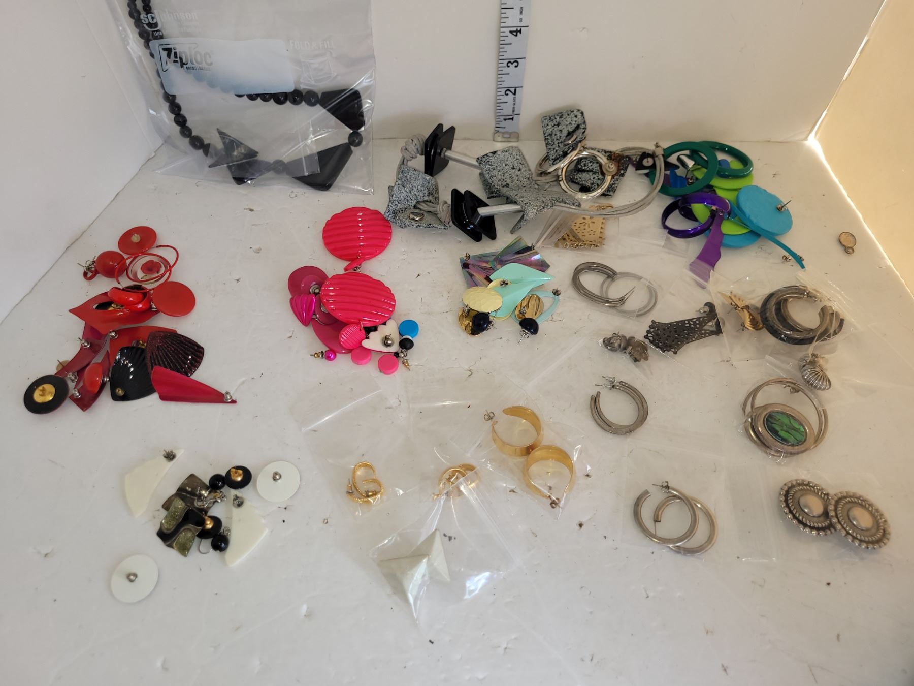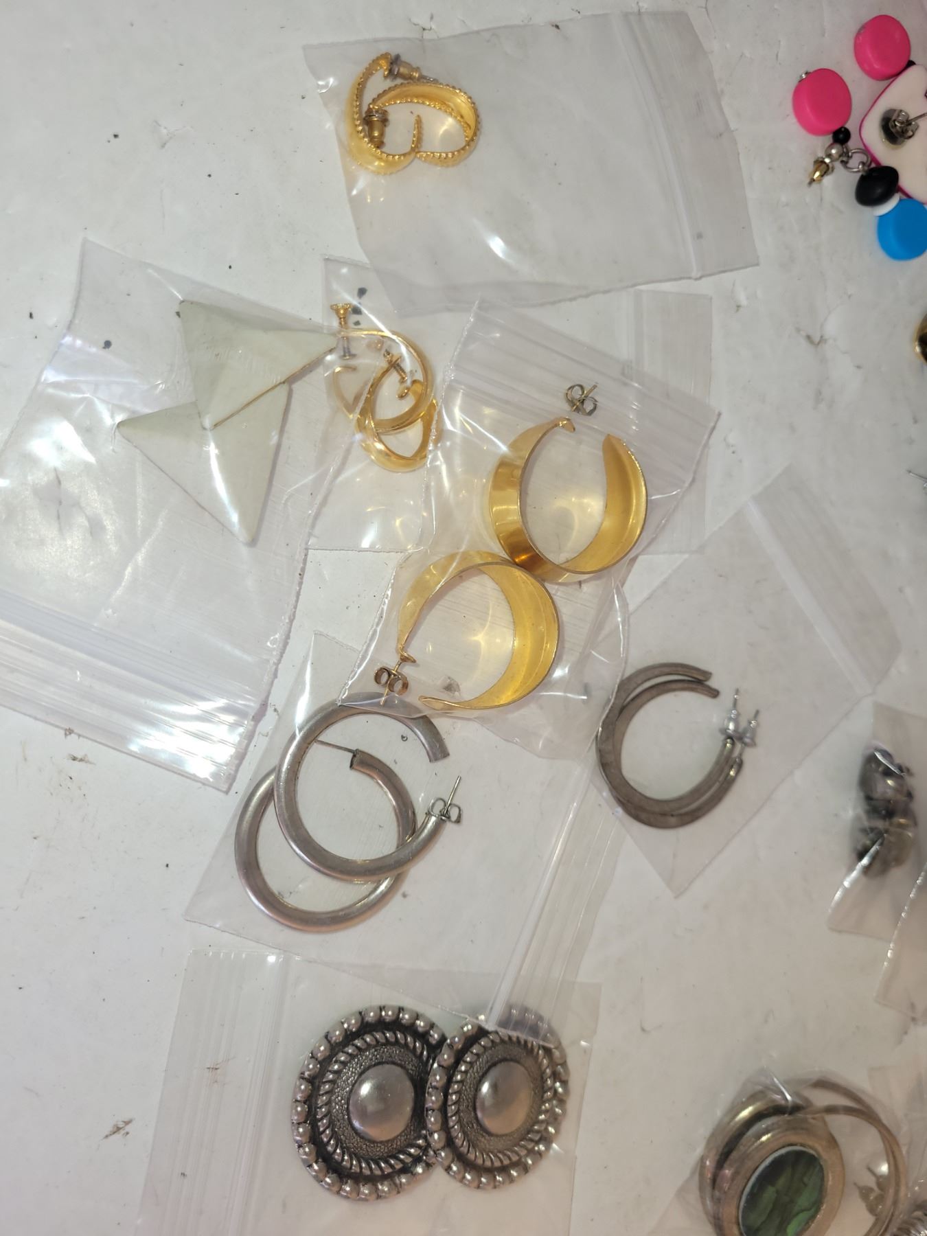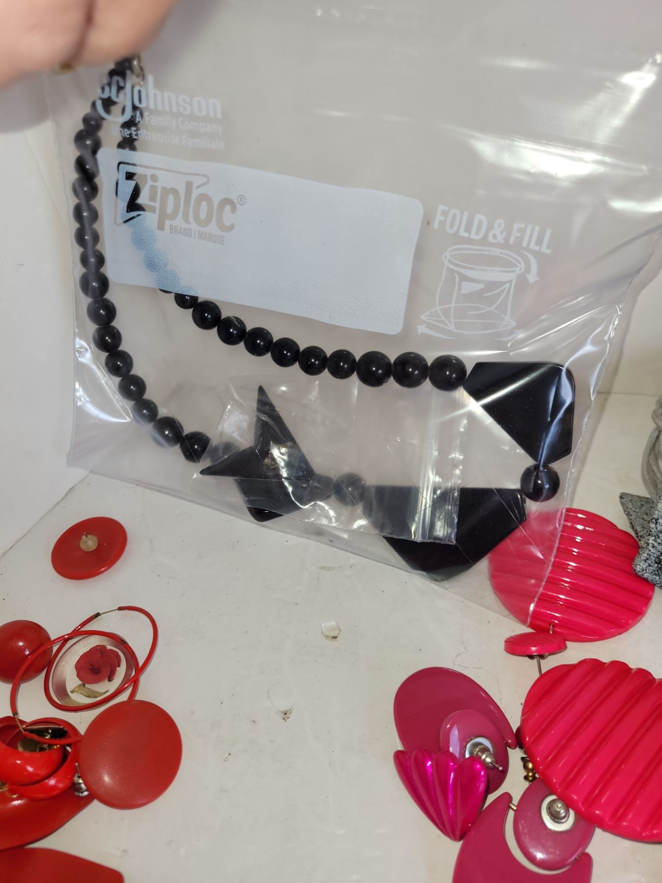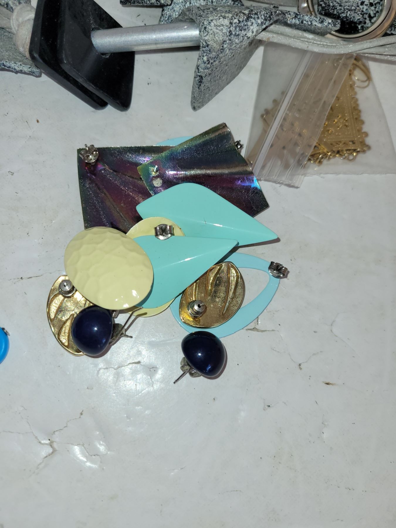2 trays of costuem jewellery, somes 80s and beyond. Silver colour wicker oval mirror, 20"w x 5.5"h, paint to your liking. 5 black plastic oval picture frames. 1 framed seaweek picture.
