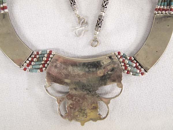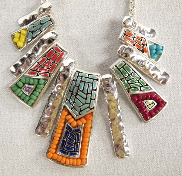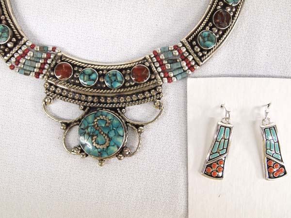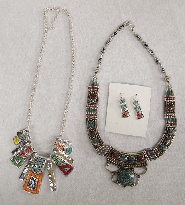 2 Tribal Style Necklaces, 1 Pair Matching Earrings, longest measures 18'' end to end with drop pendant measuring 2'', includes Nepalese Tribal Chip Inlay Turquoise and Coral Necklace and Beaded and Inlay Enamel Pendant Necklace with Matching Earrings, nice bright vibrant colors