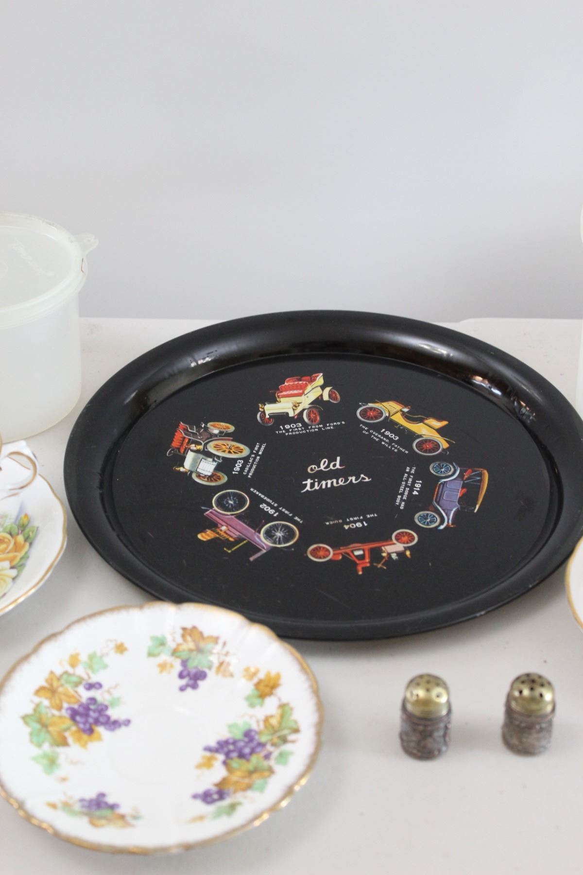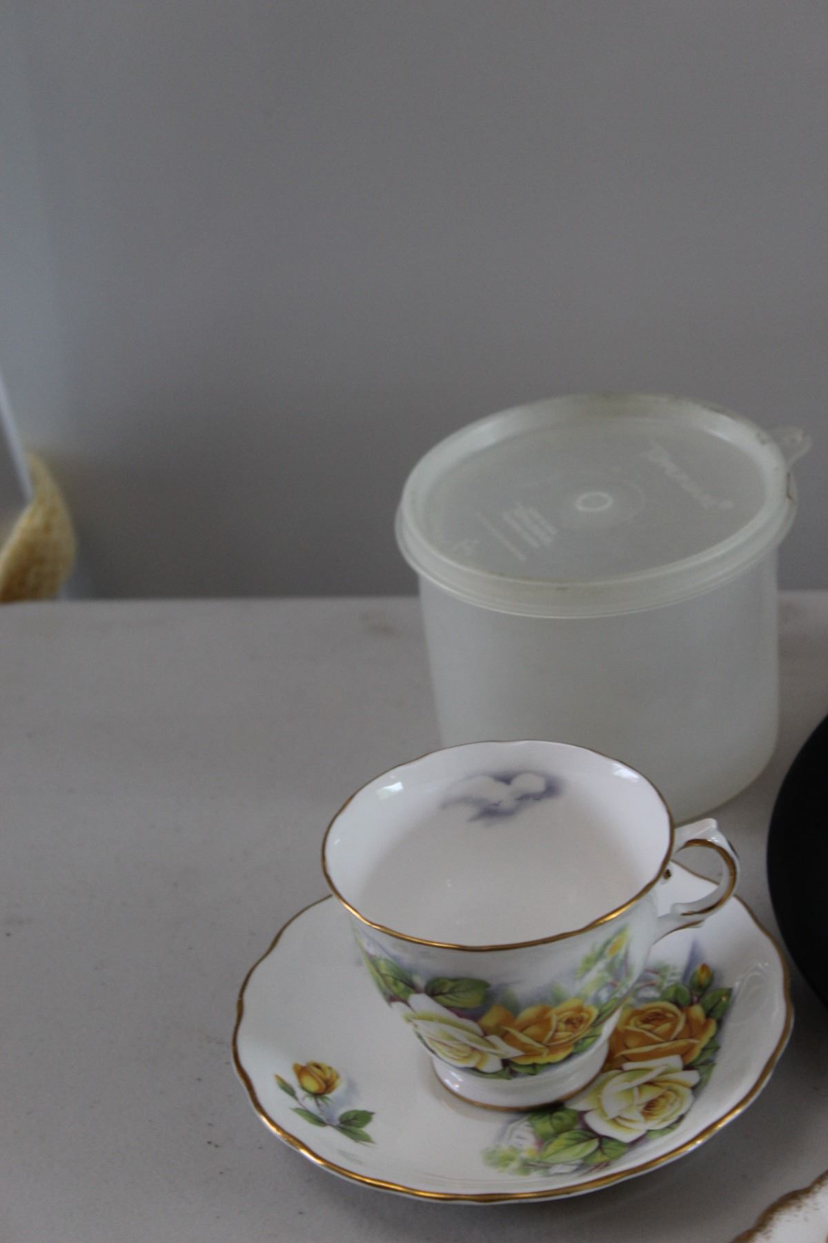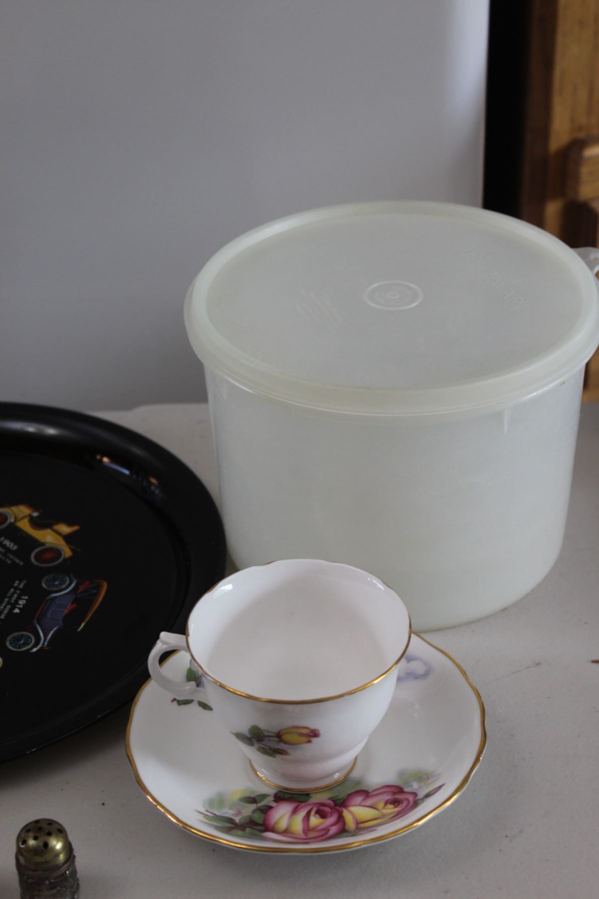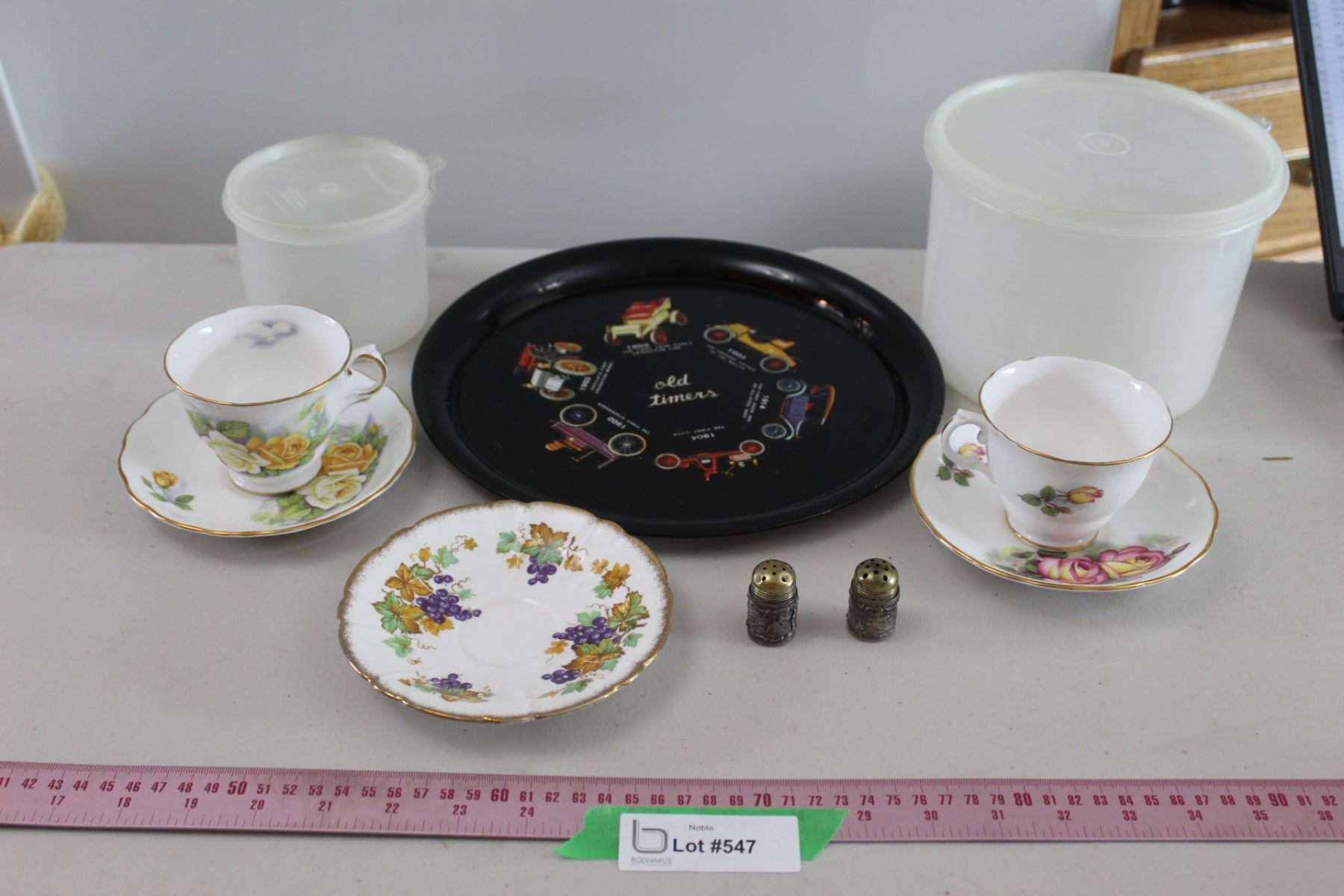 (2) Tupperware Containers, (2) Teacup Sets (Royal Osborne) & Extra Plate, Serving Tray, Brass Salt & Pepper Shakers