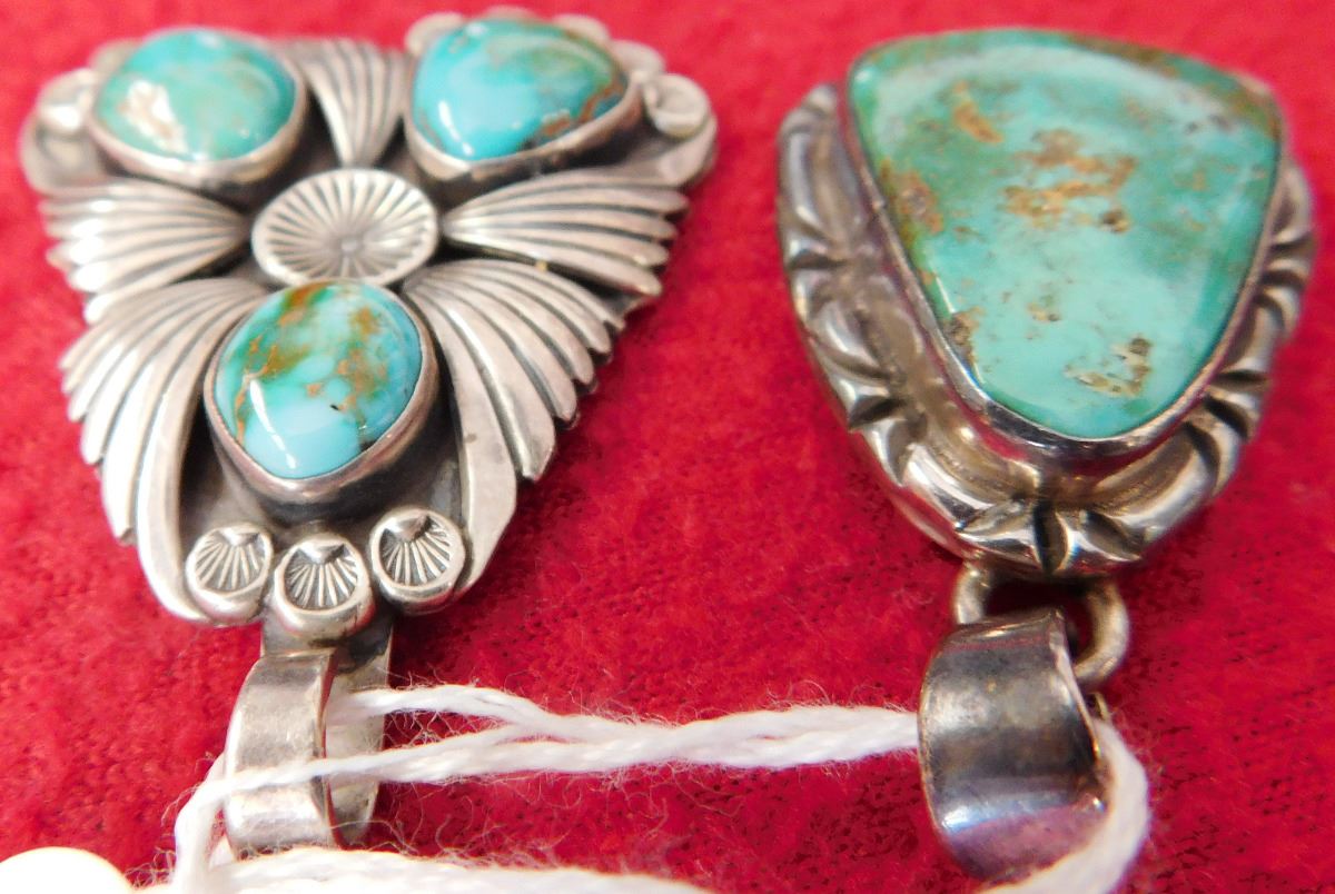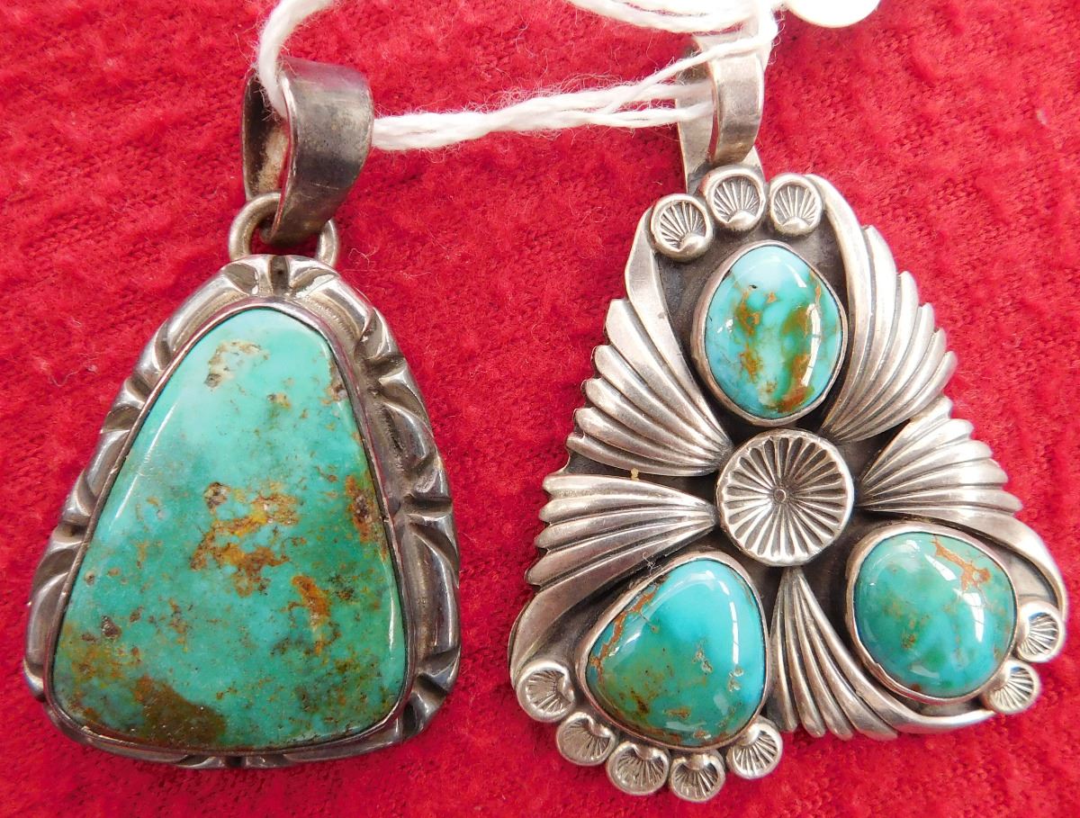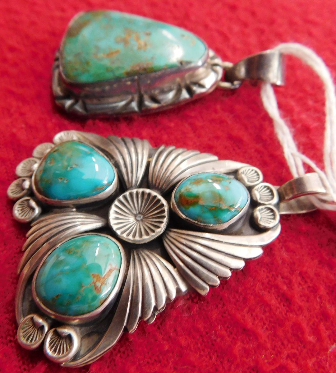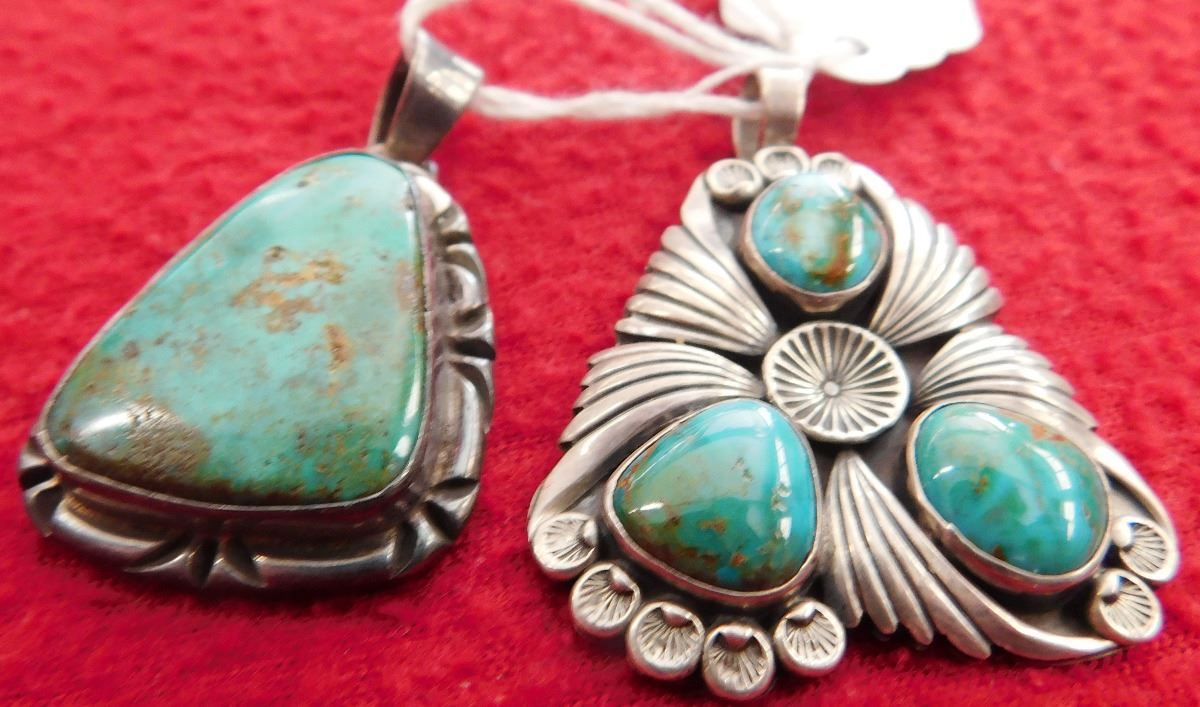 2 Turquoise & Sterling Pendants, circa 1970s. Made of sterling silver and turquoise, the Mexican pendant measures 1.5" x 1" x 0.25" and the Navajo pendant measures 1.75" x 1.25". Total lot weight is 25.5 grams. Condition: Good, see images. Shipping: $15.50 w/insurance.