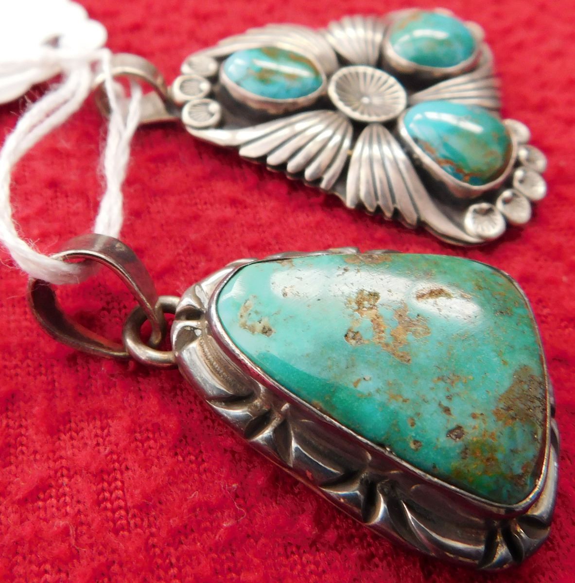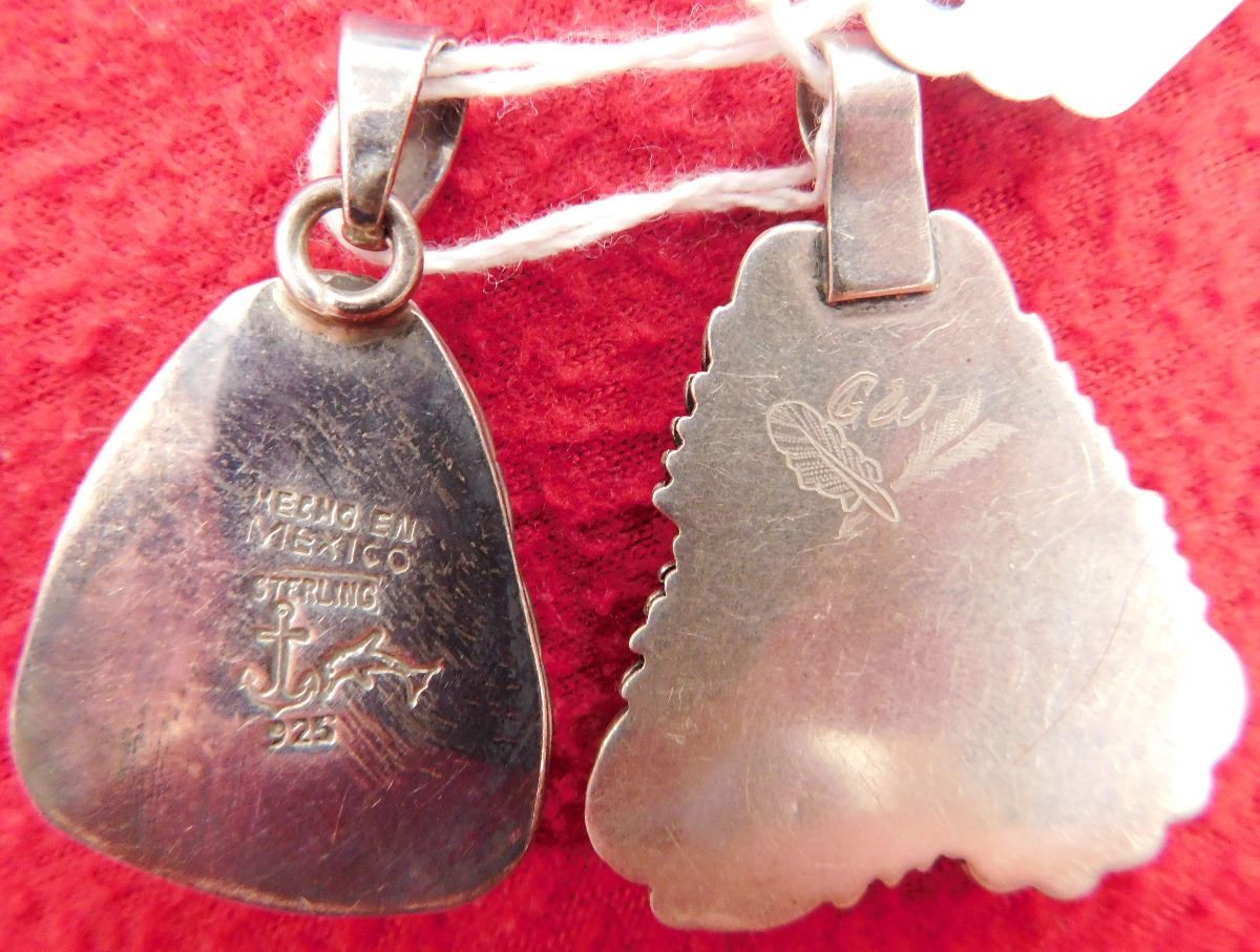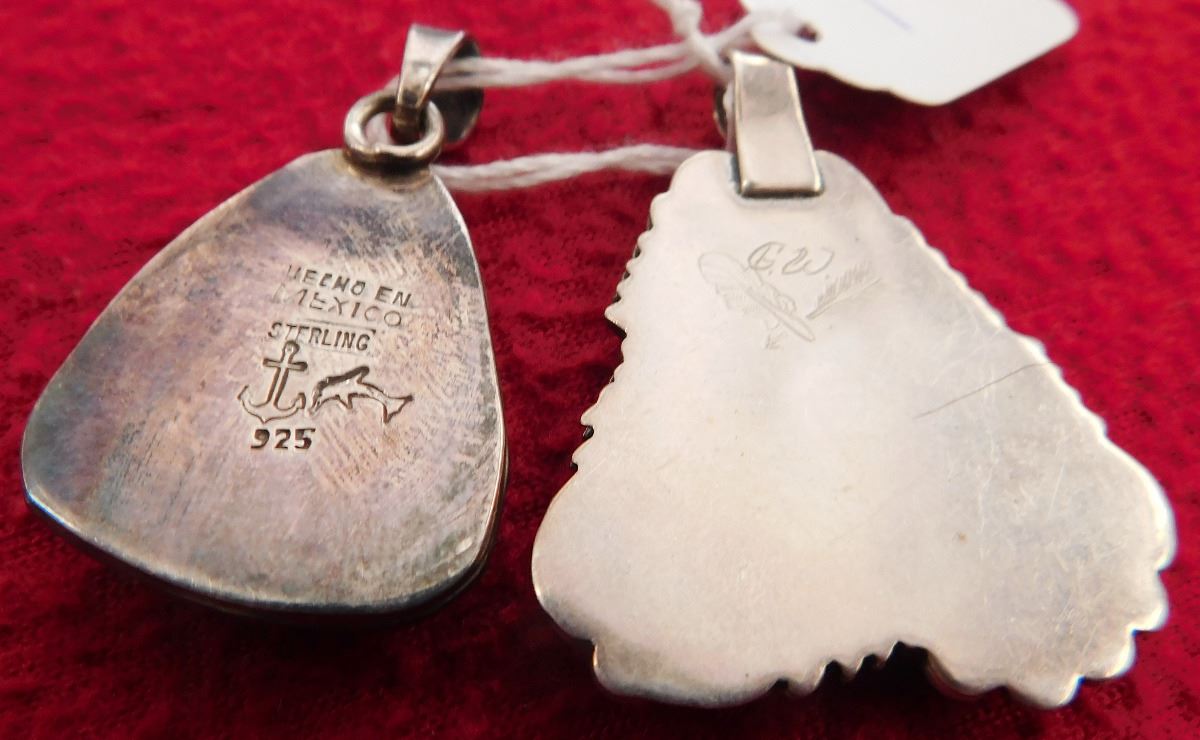 2 Turquoise & Sterling Pendants, circa 1970s. Made of sterling silver and turquoise, the Mexican pendant measures 1.5" x 1" x 0.25" and the Navajo pendant measures 1.75" x 1.25". Total lot weight is 25.5 grams. Condition: Good, see images. Shipping: $15.50 w/insurance.