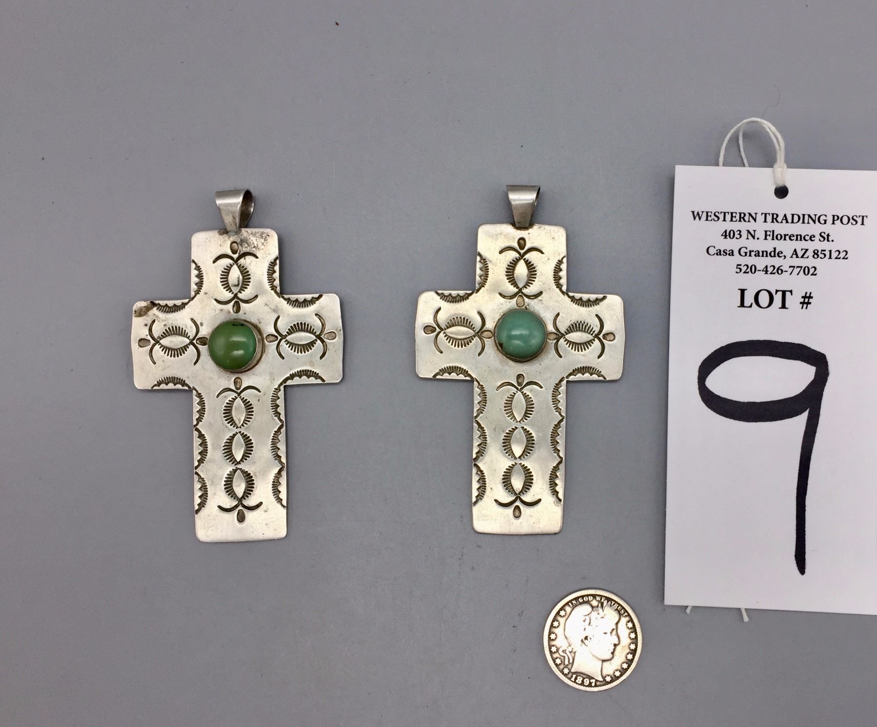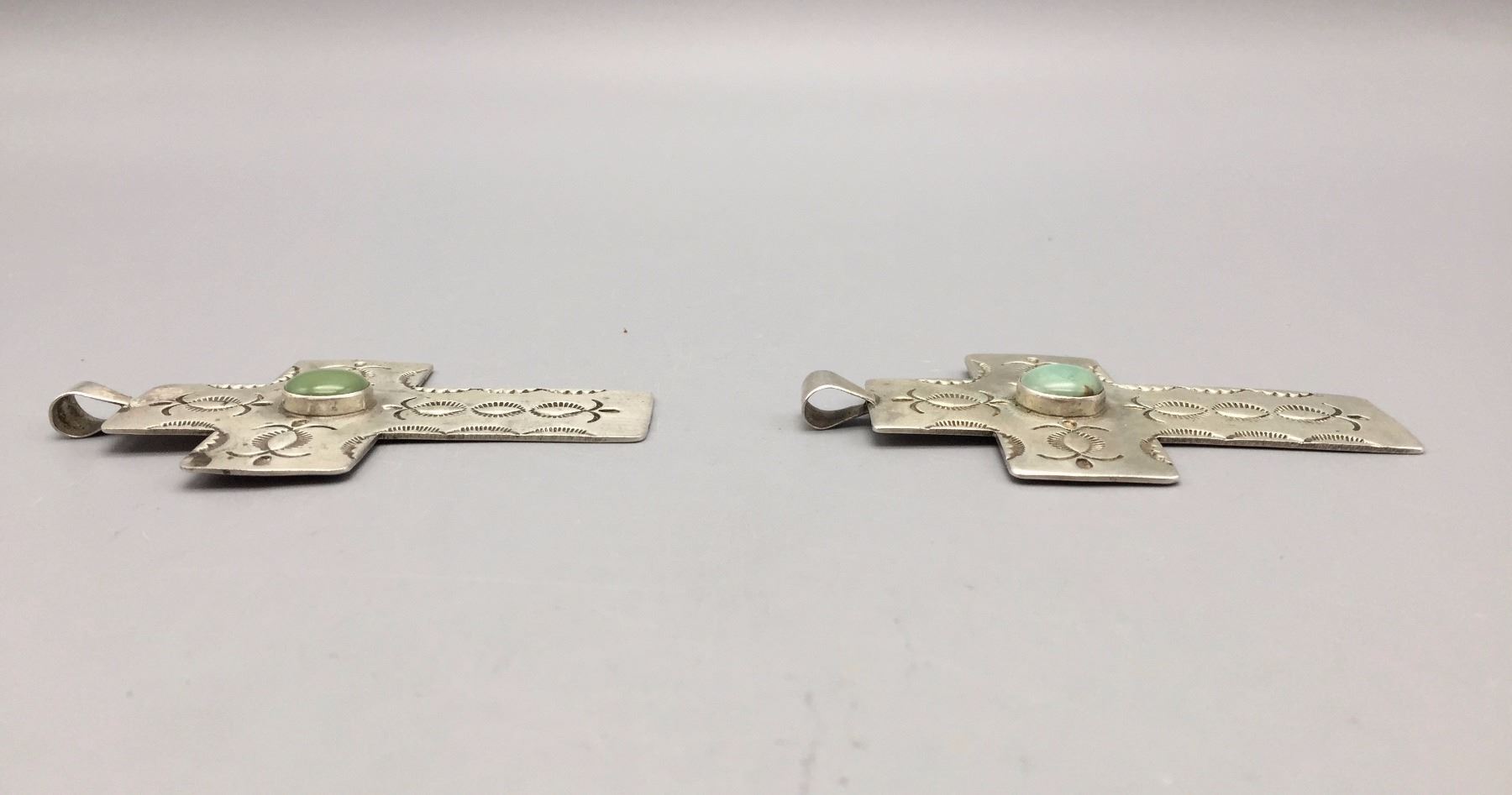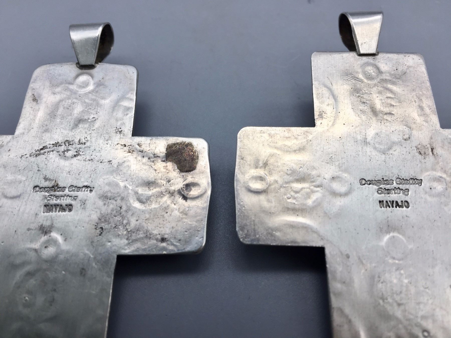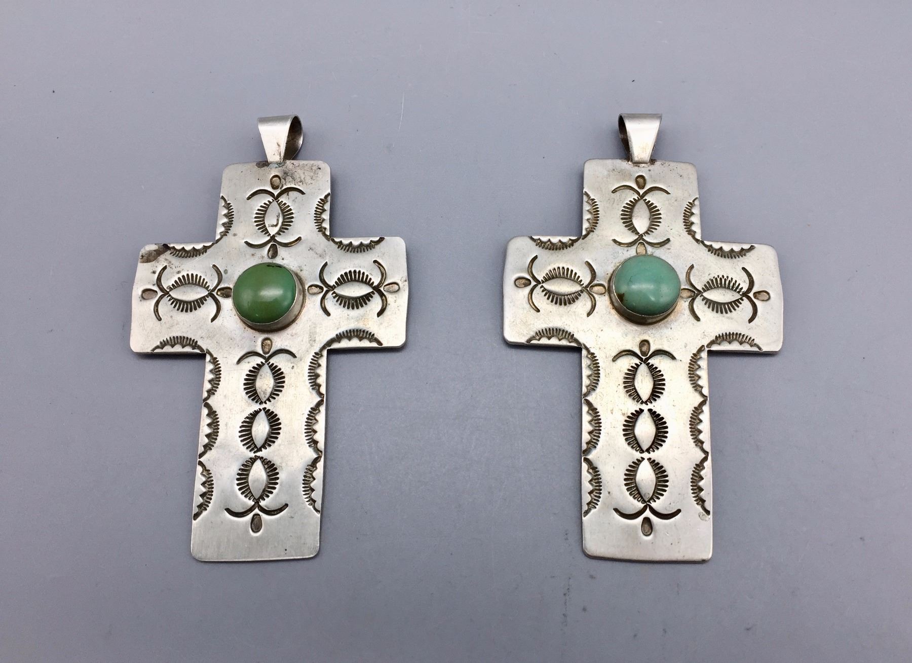 Description: Sterling silver and turquoise cross pendants.                                                                                        Maker: Hallmarked Douglas Etsitty, Navajo.                                                                                                     Approx. Age: Fairly modern.                                                                                        Size: 2" w x 3 3/8" l. 50.7 g.                                                                                                                                                                                                               Condition: Good for their age, normal wear expected. Please look closely at the pictures - they are an important part of our description. Shipping: There will be a $5 handling / packaging fee for shipping this lot. The actual cost of postage will be added on top of that.