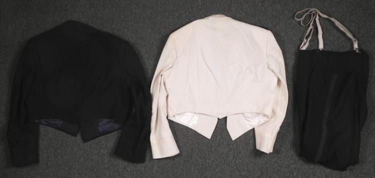 TWO U.S. AIR FORCE MAJOR VINTAGE DRESS-MESS UNIFORMS-TUXEDO WHITE & BLACK W/PANTS-INSIGNIA * OUTSTANDING U.S. AIR FORCE MAJOR'S FORMAL DRESS UNIFORMS. ONE IS TUXEDO WHITE WITH SHALL COLLAR MAJOR'S DRESS SHOULDER BOARDS WITH SHORT CUT-BLACK TUXEDO STYLE--COMES WITH MATCHING BLACK PANTS WITH SATIN SIDE STRIPE--THE OTHER COAT IS WHITE IN THE SAME STYLE--THE WHITE IS TO BE USED WITH THE BLACK PANTS AND A TRANSFER OF THE SHOULDER BOARDS.-THERE ARE TAILOR LABELS IN BOTH COATS FROM A MONTGOMERY ALABAMA TAILOR AND A US APPROVAL LABEL. SUSPENDERS INCLUDED ON PANTS.-GREAT ORIGINAL DRESS UNIFORMS *